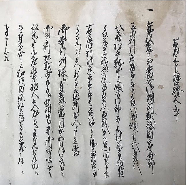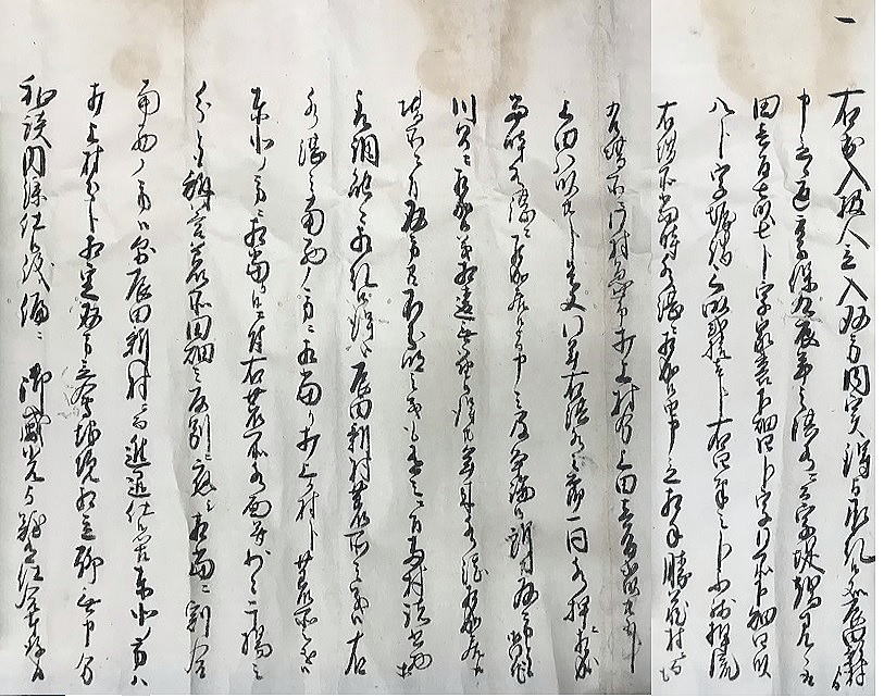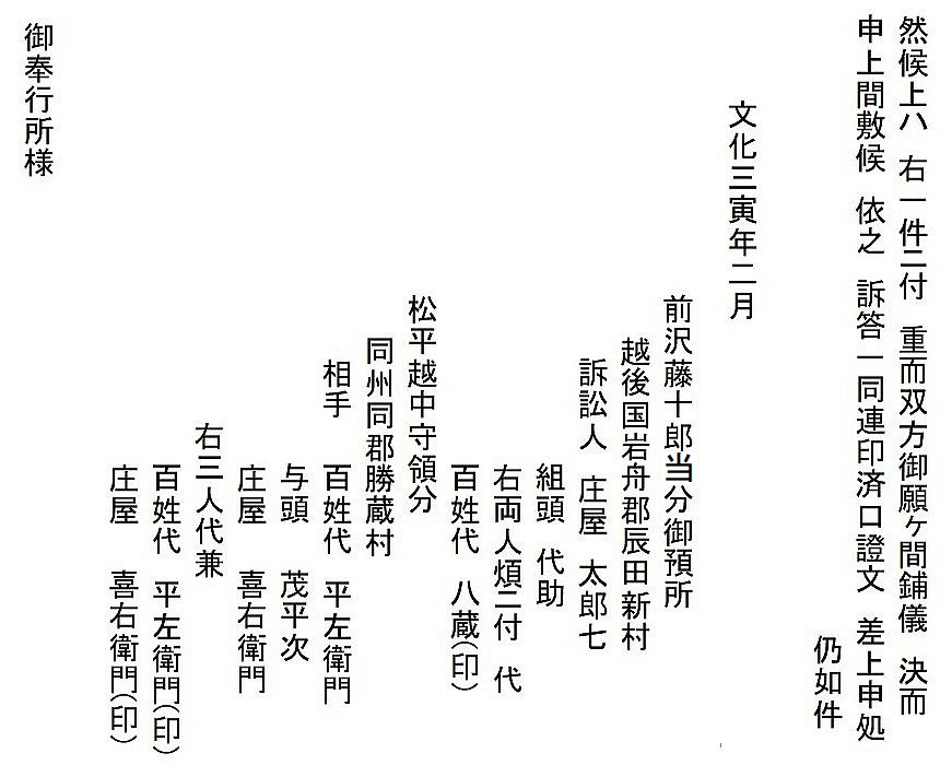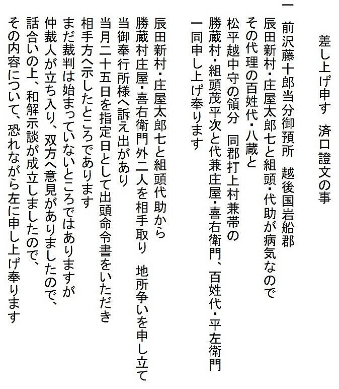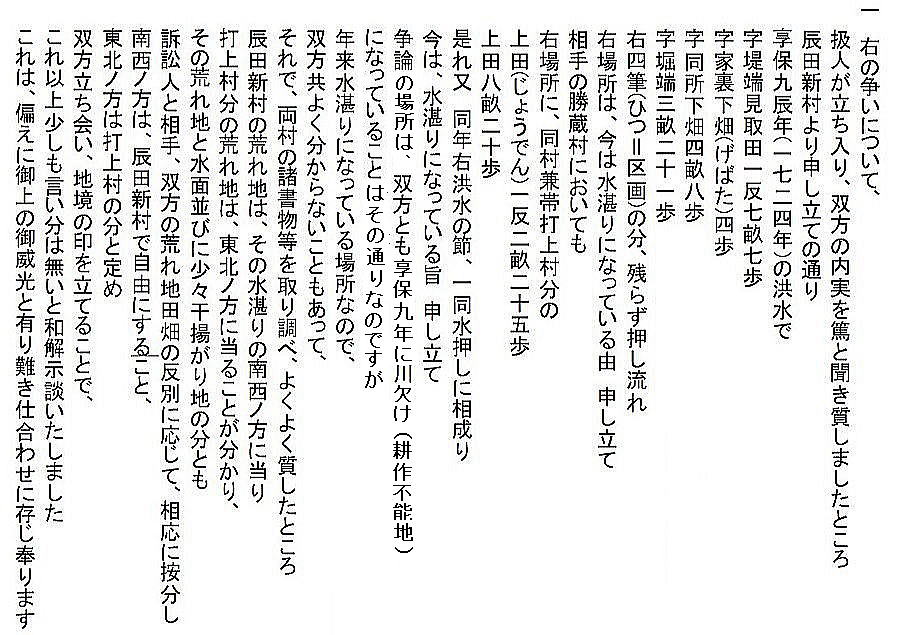 | <解説> 土地の所属について、辰田新村分か打上村分か、争いとなり領主の役所へ訴え出となりました。 1 出訴から和解示談までの経緯 訴えたのは辰田新村の村役人(庄屋・組頭・百姓代)ですが、訴えられたのは勝蔵村の村役人になっています。その理由は、打上村の村役人は勝蔵村の村役人が兼任することになっていたからです。 訴えた先は、「御奉行所様」となっています。 当時、辰田新村は幕府領(前沢藤十郎預地)で水原代官所の管内ですが、打上村も勝蔵村も白河藩(松平越中守)の領地でした。ですから、白河藩の奉行所へ訴え出たことになります。この場合、訴状には水原代官所の添書きが必要でした。つまり、水原代官所の了解の下での訴訟です。 訴状が受理されると、御差日が指定され、その日に訴状に対する答弁書をもって出頭するよう、奉行所から訴訟の相手方への命令書が発行されます。担当役人の印があるので、これを御尊判といい、この命令書を訴訟人が受け取り、持ち帰って相手方へ示し、裁判に引き出すことになります。 事はそこまで進行したのですが、まだ裁判は始まってはいません。その段階で、扱人が選出され仲裁に入ったのです。 江戸時代の裁判の多くは、法廷審理に入る前に、現地熟談内済ということで、現地で仲裁人を立て、和解示談に持ち込むのが常套手段でした。 その結果出来上がったのが、和解示談の証であるこの「済口證文」です。 多くの場合、済口證文には、仲裁した扱人の名が記されるのですが、この文書にはありません。遠く離れた白河藩にとっては、それはどうでもよいことだったのかもしれません。 ただ、この文書が小見村の平田家に残ったということは、平太郎が扱人だったからでしょう。小見村庄屋平太郎は多くの争いで扱人の役を務めています。 なお、扱人は複数が普通です。この場合は、幕府領と白川藩領の双方から出すことになります。平太郎は幕府領からです。岩船郡内の白河藩領は桃川組に属していたので、もう一人の扱人は桃川村庄屋がなったと思われます。 2 和解示談の内容 (1) 争点 この文書の時から82年前の享保9年(1724年)に洪水があり、川水が押し寄せて耕作不能になった土地がある。そこは、今(文書の時)は水溜りになっている。 そこには、辰田新村分の田畑4筆分計2反4畝40歩と、打上村分の田計2反45歩があった。 80年もたって、水堪りの一部が干上がってきたのだろう、荒れ地になっているという。そこを両村で分け合おうとしたのだろうが、元の田畑の位置や境界が不分明で争論となり、出訴に至った。 (2) 和解内容 ①扱人が両村から書き物を取り集め、改めて調べたら、 水溜りの南西の方に辰田新村の荒れ地、 東北の方に打上村の荒れ地があることが分かった ②それで、荒れ地と水溜りの水面と若干の干上がり地を、 両村の元々の田畑面積に応じて案分し、その比率で 南西の方は辰田新村の所属、 東北の方は打上村の所属と決め、 地境に印を立てる ということで、決着。 3 御上の御威光により 済口證文の最後には決まり文句として「偏に御威光と有難き仕合せ」と書かれる。これは単なる飾り言葉ではない。 戦国時代の始まりは地方小領主の領地争いで、裁いてくれる御上がいないから実力行使。 勝つためにはより強い親分を頼り、その子分になる。相手も同様。小競り合いが絶えない。 親分の戦線は拡大、子分は従軍し、自分の領地を保障してもらう。親分が没落すれば、則、自分の領地は侵略される。逆なら領地増。だから、戦の連続。 (以上の経緯については、中公新書「応仁の乱」呉座勇一著に詳しい) 江戸幕府の権威によって、この負の連鎖に終止符が打たれた。 御上に訴え出れば、扱人を選定して、双方の利害を勘案し折衷案を出してくれる。 実力行使は不必要。 こうして平和は保たれた。有難き仕合せというもの。 長い戦国の世を経ての知恵。江戸時代の平和維持策は、もっと見直されてもいいように思います。 |