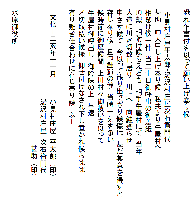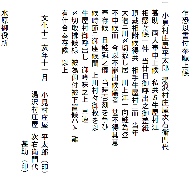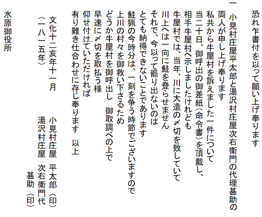 | <解説> 1 文化12年の争いの経緯 ②と③は一連の文書で、小見村と湯沢村が牛屋村を水原代官所へ訴えた際のもの。争いの経緯は次のようになる (ア) 小見村と湯沢村が牛屋村を訴えた。 この文書は残っていないが、文書③の中に訴状の内容が書いてある。 (イ) 牛屋村が対応しないので、再度、訴えた・・・文書② (ウ) これに対して、牛屋村が反論した・・・・・・文書③ 2 文書内容の大要 争いの経緯に沿って、各文書の大要を解説すれば次のようになる。(以下、小見村と湯沢村を二村という。) (ア) 二村の訴状の内容・・・文書③の前段 二村は、荒川で鮭漁をして漁業税を納めている村です。 牛屋村の者が荒川を〆切り、持ち網漁をしていて、二村はじめ川上の村々の漁に支障が出ています。度々〆切を撤去させましたが、〆切場所が多く徹底しません。 川上の漁師たちは、そこへ押しかけて〆切を撤去しようと言い出しています。しかし、そんなことをすれば争いになってしまうので、それは止めさせました。 牛屋村へ掛け合ったのですが、かれこれはっきりしない応答で、〆切を撤去しません。 寛政6年、幕府領になった頃の訴訟で、「たとえ枝川(分流)であっても〆切持ち網漁は禁止」と裁定があり、以後行わない旨の済口證文も交わしております(文書①)。牛屋村は、これに違反しており、正当な納税漁業の妨害をしております。 (イ) 二村の再度の訴え・・・文書② 二村の訴えについて、今月20日に牛屋村呼び出しの命令書を発行していただき、それを牛屋村に差し示しました。 しかし、牛屋村は、大規模な〆切をしていて川上に鮭を上らせず、出頭する様子もありません。とても納得できない状態です。 鮭漁は一刻を争う時期に来ています。どうか、川上の村々を救うために、牛屋村を呼び出して、御調べの上、すぐに〆切を撤去するよう言いつけてください。 (ウ) 牛屋村の反論・・・文書③の後段 牛屋村は漁業税として米2.0石、銀140.0匁、銭13.7貫を納税して漁をしています。 当年は、瀬繰りという杭囲み漁を行っていますのに、二村が、何の証拠もないのに不意に難題を言ってきました。 牛屋村の者が、他の村々に差障るような漁をしたり、又は、新たな漁を行ったのであれば、他から文句を言われる前に、当村でそれらを止めさせるのは当然のことです。 しかし、どの漁場でやっているのも以前からの漁法であって、それ以外の勝手な漁など決してやっておりません。 とりわけ当年は、荒川沿いの村々全て水原代官所の支配下になっいるのですが、訴え出る村はありません。特に、これまでやってきた漁について、不都合を訴える者は誰もいません。 それなのに、十数ヵ村も離れた所にある二村だけが訴訟を起こす理由などあるはずもないのです。 結局、訴人の一人小見村庄屋平太郎は、何事によらず争いの訴訟をたくらみ、村々へ難題を掛けているのです。今回だけでないのです。 どうか、今回の訴えは差戻しにしてください。そして、このような不当な争いを仕掛けたことを厳しく注意してください。 3 この争いの顛末 この件の結果については、この2通以外に文書がなく、不明。 訴訟が受理されて、呼び出し状が発行されたのが11月20日、それを受けての文書②も11月だから、多分月末になったろう。文書③の日付は11月になっているが、実際の提出は、12月に入っていただろう。「すぐに作成したのですが、都合があって提出が遅れました」とかなんとか言って。 それから代官所での審査が始まったとすれば、おそらく、決着がつかないまま漁期が過ぎ、黒白つかずに終わったのではないだろうか。 牛屋村の漁師が行っているのは〆切持ち網漁ではなく、杭囲み瀬繰り網漁だという言い分が、このときは通ったのかもしれない。 杭囲み瀬繰り網漁というのはよく分からないが、三面川では現在も居繰り網漁が行われている。それは2艘の舟で網を手繰り絞っていく。だから、瀬繰りは、川を杭で囲んでおいて網を徐々に絞っていく漁なのかもしれない。 川を完全に〆切ってしまうのとは違うという主張だが、杭を所々引き抜けば、どちらの漁法かは判別できない。 4 この後の展開 この3年後、文政元(1818)年に、荒川上流18ヵ村が牛屋村と金屋村を訴えるという争いが起こっていて、その際の和解取決め・済口證文が残っている。(文書④・文書⑤) その文書によると、下流の牛屋村・金屋村で〆切持ち網漁がやられていたことは事実だった。 このことからすれば、河口に近い下流域では、常に〆切漁がこっそりと行われていた疑いがある。何しろ漁獲率の高い漁なのだから。 しかし、いくつもに分流した川幅の広い下流域で、各所に散らばった漁場を見張るのは容易でない。それを見込んで、最盛期に入った頃を見計らって短期決戦で違法漁業をしていたとも考えられる。3年後の訴訟で明らかになるのだが、牛屋村としても、すべての漁場を把握しきれてはいなかったようだ。 今回、文化12年の訴訟は、最盛期に