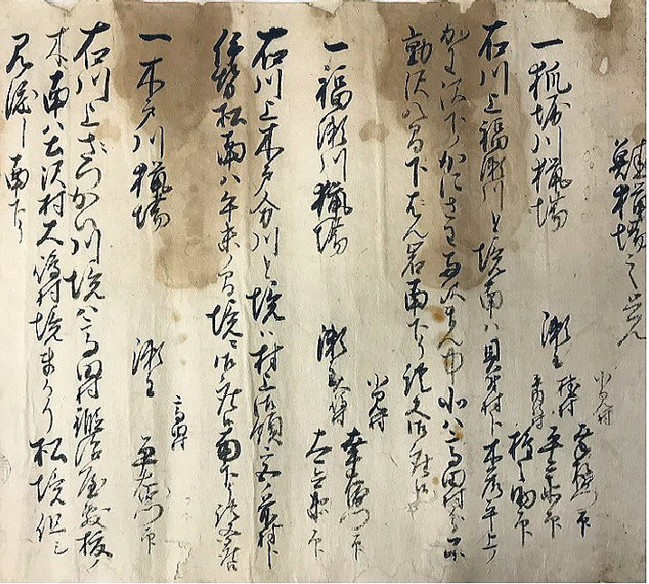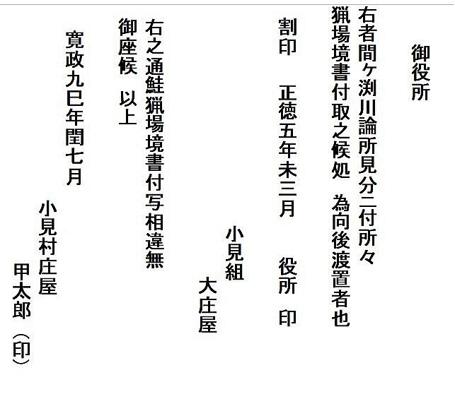 | 「平内新村と大島村の鮭猟場出入①(文書№510)」⇒こちら 「平内新村と大島村の鮭猟場出入②(文書№507)」⇒こちら 「正徳4年の鮭漁場の覚」(文書№506)⇒こちら <文書№508の解説> 正徳4(1714)年に作成された「鮭漁場の覚」を寛政9年7月に小見村庄屋甲太郎が写したもの。寛政9年に、平内新村と大島村が鮭猟場の権利について争った際に作成されたものであろう。その際の済口證文が文書№507である。 9ヶ所の漁場が書いてあるが、寛政9年の争いは4番目の「さつかい川(雑貝川)」の漁場の争いである。ただし、文書№507の済口證文の内容としては、雑貝川の境については問題になっていない。むしろ、境が問題になったのは、それより21年前の安永5(1776)年の争いである。その際の文書(文書№510)には、「漁場はどこも字(あざ)を区切りにして、川上川下南北見通しの境を立てている」と書かれてあって、この「鮭猟場の覚」を読むと、その意味がよく分かる。なお、正徳4年の正本も、残されてある。(文書№506) ところで、この文書に書いてある9ヶ所の漁場の名称は、上述のように字(あざ)、つまり地名である。荒川に流れ込む枝沢の名を地名にしたのだろうか。 最初の「狐堀川」が一番下流の漁場で、その川上が「福瀬川」漁場というふうに、上流に上がってくる並びになっている。 各漁場の境が書いてあるのだが、その分析は、文書№506に記す。 |