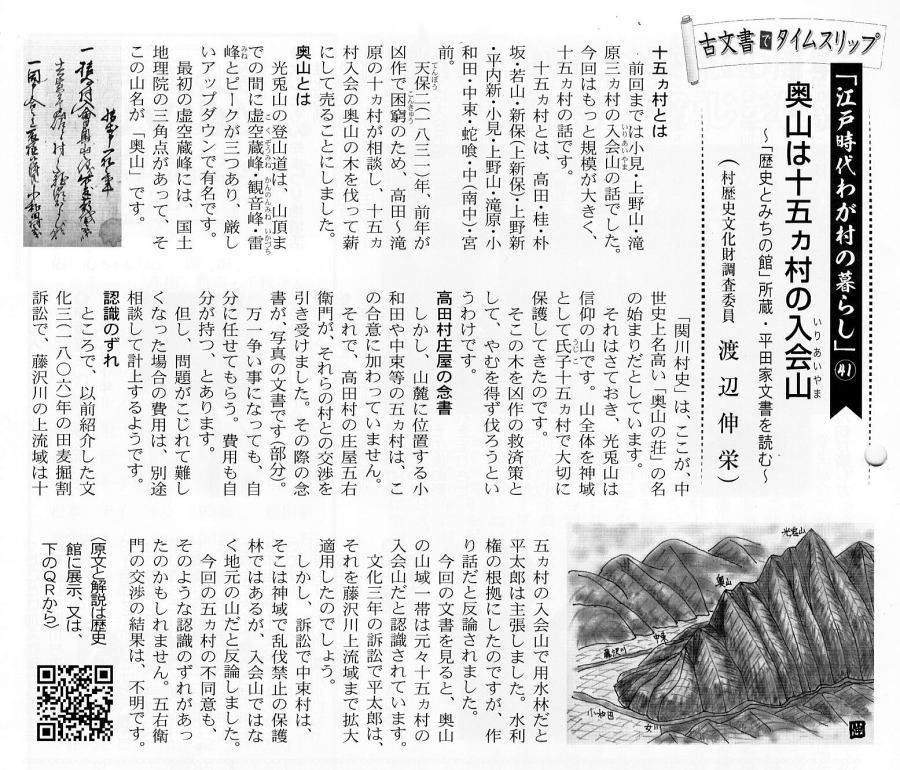 | <解説> 凶作の年に、入会山の薪を伐り出し、その収益で生活困窮事態を凌ごうとした文書で、文書№515や文書№736と同様の文書である。 ただ、上記2文書は、小見村、上野山村、瀧原村の三ヶ村入会山の話だったが、この文書は15ヶ村の入会山の奥山の話。15ヶ村というのは、 末尾に列記されている、高田、桂、朴坂、若山(外2村は新保、上野新)、平内新、小見、上野山、瀧原の10村と、本文に出てくる小和田、村上藩領の中束、蛇喰、中、宮前の5村 (1) 文書内容の概要 前年の凶作対応のため、15村の入会である奥山の薪を伐り出すことで話合いをした。 ところが、小和田村が、合意を渋った。それで、高田村庄屋が小和田村に対応することを引き受けた。訴訟など面倒なことになっても、自分が引き受けると。そのための費用も自分持ち出しでやる。 小和田村以外にも、村上藩領の4ヶ村も難しいことを言うかもしれないが、それも自分が引き受けた。 難しい事態になったら、その時は改めて相談する。難しくなった場合の費用のことは、別紙の取決め證文に書いてある通り、準備金の中から受払いして、定められた年限の内で返す。そうなったら、證文は反故にしてもらう。 ざっと、こんな内容。 (2) 光兎山域の15ヶ村入会山 この文書より25年も前、文化3年の「田麦掘割訴訟事件」でも、光兎山域の15ヶ村入会山の件が問題になった。 その事件で原告の平太郎は、藤沢川の上流水源域は15ヶ村入会山の用水林だということで、水利権を主張して訴えたのだった。 そのときの中束村は、平太郎の主張に対して次のように反論した。 藤沢川上流域は、光兎山の神域でみだりに木を切ると神の怒りにふれ川が荒れるということで、15ヶ村で大事に保護してきた。しかし、入会山ということではなく、あくまでも中束の地元の山であると。 裁判の中で、結局、平太郎の主張は作り話だとされ、中束の主張は認められた。(但し、水争い訴訟の本筋ではないため、論点としては取り上げられなかった。) 今回のこの文書を見ると、光兎山の一角である奥山の山麓は15ヶ村の入会山であることは、共通の認識でいたことが分かる。 文化3年の訴訟の発端となった、その前年の大栗田不法伐採問題の文書でも、「私共入会の光兎山境内やそのほか藤沢の所々で」とあって、当時、この内容を15ヶ村一同認めている。 つまり、「私共入会の光兎山境内」というのが、今回の文書の奥山入会のことであって、「そのほか藤沢の所々で」で、平太郎は、「私共入会」を藤沢川上流域まで拡大適用したのだ。しかし、多少無理な拡大適用であったため、中束村から頑強に反対されることになってしまった。 今回の文書によって、田麦掘割訴訟での15ヶ村入会山問題は、以上のように理解することができる。 (3) 小和田村の不同意 ところで、小和田村はなぜ合意を渋ったのだろうか。 その理由を文書には、「小和田村は山岸の村立ち故、心得違いにて、山本は存じ居り候哉」とある。この文の意味が難しい。 まず、山岸は、山の急崖が川に落ち込む地形のこと。村立ちは、村の有様。実際、小和田村から見た奥山および光兎山の山域は、女川の流れを挟んで急崖になっている。 その様な村だから「心得違い」、つまり思い違いが生じた。どんな思い違いかというと、「山本は存じ居り候哉」。この意味は、山本を知っているのだろうか。山本は山の麓、或いは地元と同じで所属の意味か。 とすると、次のように解釈できる。 小和田村は、山の急崖が女川に落ち込む岸辺の(対岸の)村だから、奥山がどこの地元の山かについて、何か思い違いをしているようだ、ということだろう。 奥山の地形を見ると、小和田村のある女川側は急斜面だが、藤沢川側は緩斜面で中束村へ下っている。ということは、小和田村の思い違いというのは、奥山は中束村の地元の山だと小和田村は思っているということになるのではないだろうか。 (4) 御私領四ヶ村の不同意 交渉説得を引き受けた五右衛門にとって、小和田村の思い違いを正すことは、そう難しくないと思っているように文書のニュアンスから感じられる。 それに対して、私領四ヶ村との交渉は難航しそうだと思っているようだ。 私領とは村上藩領のことで、中束、蛇喰、中、宮前の4村。 15ヶ村は、元々村上藩領だった時代は女川組あるいは小見組としてまとまっていた。村上藩領と幕府領に別れた後も、生活基盤は一緒なので、まとまって協力してきた。しかし、領主が違うことで、何かと行き違いが生じることもあったのだろう。25年前の田麦掘割訴訟はその代表例。 それで今回も、中束村は地元の山だと思っていて立木の伐採にはなかなか同意できない。他の3ヶ村も村上藩領として中束村と一体感をもっていて、共同歩調をとるのだろう。 交渉は簡単には進まないと、五右衛門は思っているから、そのような場合に備えて別紙の取り決め証文を作成した。別紙が残っていないので、その内容は不明だが、本文の書き方