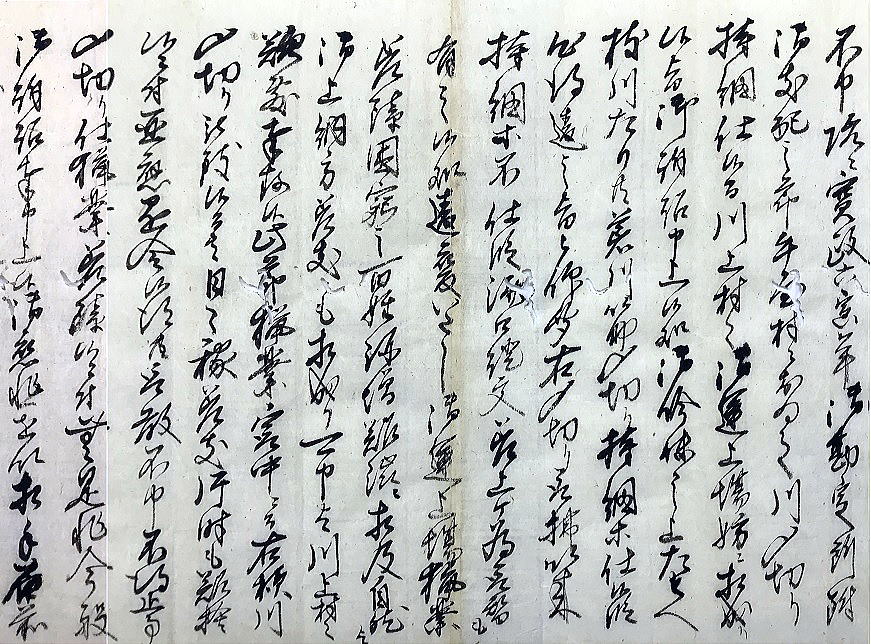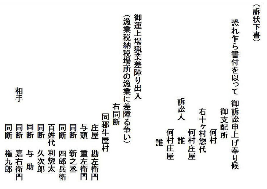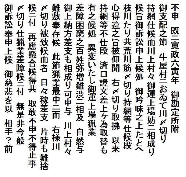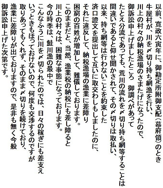 | <解説> この文書は、訴状の下書きで、これをもとに関係する村々と下相談したものと思われる。 訴えの内容は、大略次の通り。 牛屋村と金屋村の者が荒川の下流で〆切持ち網漁をしていて、川上の村は困っている。実力行使で取り払おうと言う者もいるが、それでは抗争になる。それで、両村と交渉をするのだが、何かにとごまかして〆切を取り払わない。 このことは、寛政6年の訴訟で、〆切漁はたとえ枝川(分流)であっても禁止であると裁定され、以後行わないことを約束して済口證文も提出した。 それなのに、違反漁業を行っていて、何度も交渉するのだが、取り合ってくれない。仕方なく、今回、訴訟を起こした。どうか、〆切を取り払わせていただきたい。 3年前の小見村・湯沢村2村が訴えたのとほぼ同じ内容。ただし、今回は牛屋村だけでなく金屋村も相手に入れている。事前に下調べして、金屋村の者もやっていることが分かったからであろう。 訴訟人の名は書かれていないが、この訴訟の結果である⑤の文書で明らかになる。 |