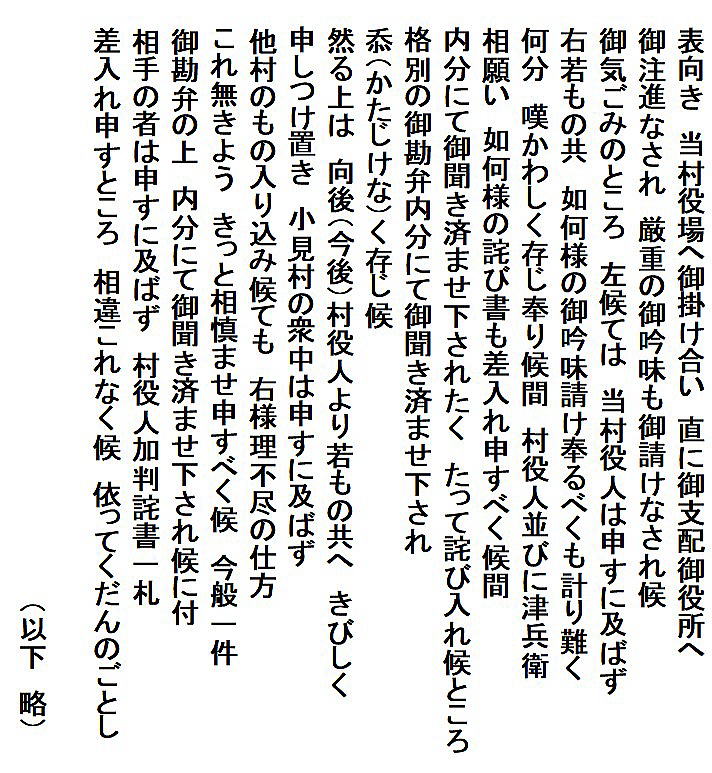 | <解説> 乙(きのと)村(現・胎内市)の関係者から小見村平太郎宛の詫び証文。 平太郎は小見村の庄屋だが、この文書は私的関係ということなのだろう、肩書はない。 分かりやすい文章で、何があったのかは読めばすぐわかる。 天保12(1841)年6月23日は新暦でいえば8月9日だから、夏祭りの夜。地元の若者たち、花火大会で酒でも飲んで浮かれていたのか。 そこへ通りかかった平太郎の忰柳吉はとんだ災難に遭ってしまった。今で言えば警察沙汰になる事態。若者の親たちは大うろたえだったろう。庄屋以下の村役人も代官所から管理責任を問われかねない。何卒内分にと、必死のお願いがなされて、その結果としてのこの文書。 押印の6名中、3名は加害者、もう3名は村役人。村方三役といって、村行政のトップが「庄屋」、その補佐役が「組頭」、村の構成員である百姓(自作農=納税者)の代表が「百姓代」。江戸時代の文書にはよく出てくる。村長、助役(副村長)、議長(議会はないが)みたいな感じか。 平田家系図によれば、柳吉は、その後父の跡を継いで第14代平太郎を襲名。明治30年(1897年)まで存命しているので、この時のケガはその後にそれほど影響はなかったものと思われる。 同系図には、柳吉の祖父12代平太郎の後妻が乙村常田氏の娘、とある。つまり、柳吉の祖母に当たる方が乙村の出。その縁もあって乙宝寺の夏祭りの夜の参詣となったのだろう。平太郎が事を収めたのも、あるいはその縁があってのことかもしれない。 余談ながら、筆者(渡辺)の祖父は乙の隣村荒屋の出で、幼児、祖父の生家に泊まって乙宝寺の夏祭りに行った幽かな記憶がある。花火の記憶はないが夜店が沢山並んだ賑やかさは、祭りで買ってもらって舐めた笹飴の味と共に、70年以上たった今も浮かんでくる。 |