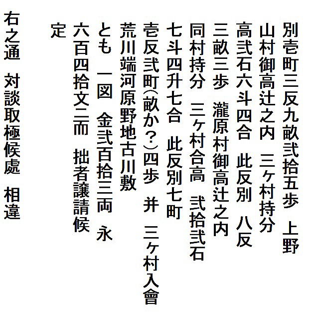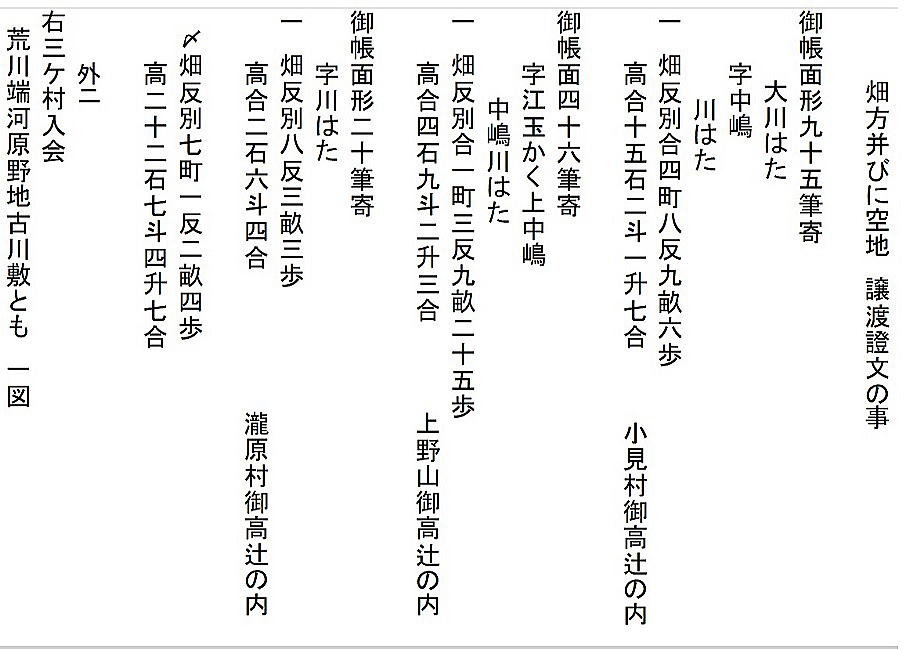 | ~解 説~ <中島について> 荒川と大石川の合流点には、かつて大きな中洲があって、「中島」と言っていました。 もっとも、大河川の荒川には中島が多く、単に中島と言っただけではどこの中島かわかりません。 この文書の中島は、「上関村地内、字六本杉」と地名が記されているので、大石川と荒川の合流点の中島のことだと分かります。 この「中島」は、昭和42年の大水害とその後の改修で姿を変え、今は、トンボ池のある河川公園になっています。(地図参照のこと) <四通の文書の内容> ①は、上関村庄屋寅吉が、「中島」の土地を買い取るに当たり、持主の小見村・上野山村・瀧原村三ヶ村と取極めた内容の確認を求めたもの ②は、三ヶ村から水原代官所の役人へ、「中島」の土地を寅吉へ譲渡すると届け出たもの ③は、②の下書き ④は、三ヶ村の土地の持主全員が、寅吉へ土地を譲渡することを承諾した証文 ①の内容 ・ 中島の新田開発のため、六本杉の前川から分水し、治郎左衛門新田の用水路を拡げる ・ 開発面積は、三ヶ村の持分合計7町1反2畝4歩で、納税の基準高は22石7斗4升7合 ・ 合わせて、三ヶ村入会地になっている川原や古川敷も譲り受ける ・ 代金は、金213両永640文で、話がまとまった ・ この後、測量を行い、用水路ができたら代金を払い、証文をもらう ・ その後の新田開発の段になって異議など出ないように、この取極め書を取交す ②の内容 ・ 中島にある土地三ヶ村分合計面積7町1反5畝4歩を上関村庄屋寅吉へ譲渡する ・ 納税基準高は、24石5斗4升7合 ・ 畑は田に替え、野地や古川敷も新田にする寅吉の計画に、三ヶ村は全く異議なく村内一同納得している ・ この上、貴方(代官所役人)に御苦労をおかけすることはない ・ 以上について、粗絵図面を添えて、申上げる ③の内容・・・②に同じ ④の内容 ・ ①の面積・石高の畑地と空地、ほかに河原の野地と旧河川敷も併せ、絵図と検地帳写しをつけて、譲渡代金は金213両永640文 ・ このことを代官所も承知したので、持主一同相談し、寅吉に譲渡することに決定した ・ この度、代金を確かに受け取り持主銘々に分けたので、土地は寅吉へ渡すこと ・ 以後、この土地は寅吉が所持し、もし、土地の境のことで隣の持主などといざこざが生じたら、(元の持ち主である)三ヶ村が引き受けて問題を解決し、寅吉には損を掛けない ・ 来年3月からの年貢や諸役は、寅吉が務めること <補足> 土地面積、石高が②の文書だけ少し違っていますが、その理由は不明です。石高は納税の基準になるので、代官所が少々多めに見積もらせたのかなどと邪推しています。 当時は土地の私有はありえず、すべて公有。売り買いはあくまでも利用権の譲渡が建前。代官所の事前了解が必要です。 だから、③の下書きは、事前に代官所とすり合わせたのではないかと思います。いきなり売買結果を届けるということはないでしょう。寅吉にしても、事前に代官所の内諾を得ていると思われます。 代官所としては、納税を確保できる相手であるかどうかが大事です。まして、畑や荒れ地から新田への開墾開発となれば、その後の年貢の増加を期待できますから。 ①②④の三通がセットになっているお陰で、当時の土地の売買にかかわる持主(売主)、代官所、買主の三者関係が分かります。 ところで、①と②の文書には、差出人に印が押してありますが、④には印がなく、かつ訂正箇所もあります。さらに、①と②には、文書の紙の継ぎ目に印が押してありますが、④にはそれもありません。 このことからすると、 ①は、寅吉からの実物文書(正本) ②は、代官所へ宛てた文書の控え(副本) ④は、四十二名が押印する前の下書き ということになると思います。 それにしても、小見村から4㎞(1里)も上流の「中島」に三ヶ村が土地を所有していたのはどういう理由なのか、興味がありますが、今のところ謎です。 ただ、耕作等のために川舟を使って川を上下していたことは十分想像できます。底の平らな川舟は、流れの急な瀬でも、岸辺の流れが比較的緩い浅瀬を川石に底をこするようにしてさかのぼっていくのを、子どもの頃何度も見ています。荒川沿岸で暮らす人々は、多く川の民でもあったようです。 |