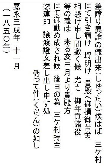 | ④ 11月 三ケ村畑地空地持主42名連名 上関村庄屋寅吉宛 「畑地空地譲渡證文」 平田家文書№594 |