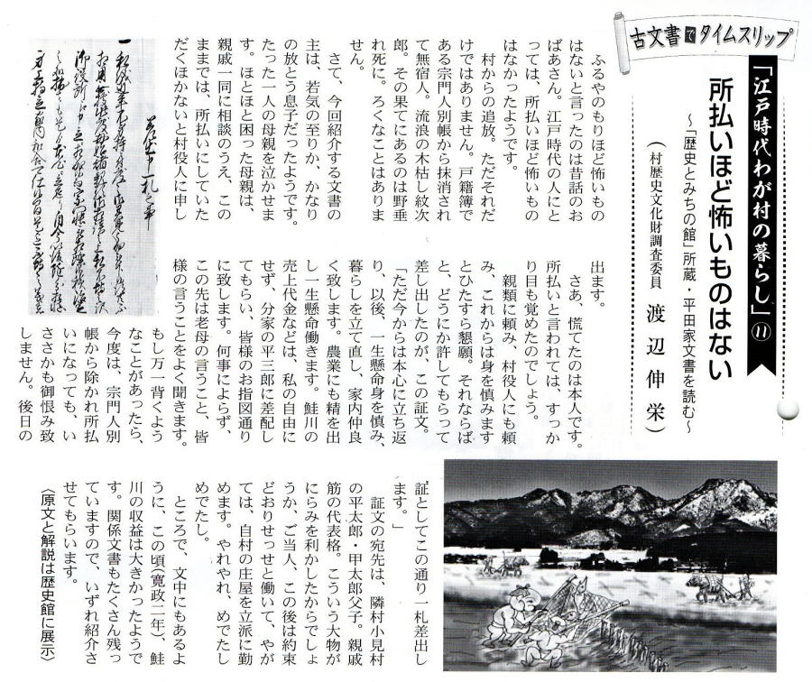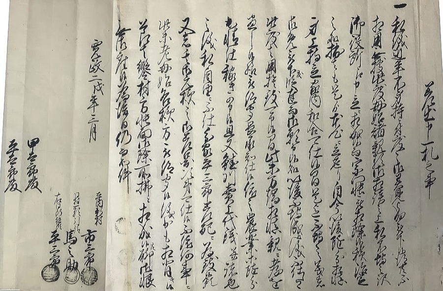 | <解説> この文書は分かりやすく、内容は広報紙に掲載した通りなので、特別の解説は不要と思います。ただ、平内新村の市三郎が、なぜ小見村の平太郎・甲太郎父子宛にこの文書を出したのか、その背景について解説します。(以下は、主に平田家系図「奥州会津平田氏系譜」平田大六氏蔵に依っています。) 1 文書の宛先・平太郎家について 小見村の平田平太郎家は、上杉景勝が徳川家康に敗れて米沢領主となった後、上杉家の禄(給与)を離れ小見に土着した平田平内から始まっています。平内は、水利の悪い荒川右岸段丘上の原野の開拓に専念し、平内新村、滝原村を開いています。 平内が小見に土着するについては、祖父・平田常範に由縁がありました。常範は、関ケ原合戦(1600年)の前年、会津領主の景勝が、旧領の越後各地に騒乱を起こすことを企図した「越後一揆」の指揮官の一人として下越後へ進出し、小見村に駐屯します。 しかし、関ケ原で家康が勝者となって越後騒乱の企ては失敗、常範は米沢へ引き揚げるのですが、下越後進出の際に多くの配下(一族郎党)を連れてきていて、それらの中には、米沢へ戻らずに現地に残った人たちもいます。平内が小見村に土着するについては、そのような地縁血縁があったからと思われます。これら一族郎党の人々が、平内の新田開発に大いに与力したことでしょう。 以来、平内の子孫は代々平太郎を名乗り、一族は、荒川右岸の山間部や川原荒地の新田開発に力を注ぎます。(平田甲太郎家文書には、新田開発関係の文書も多数あります。) なお、平田家では、家の始祖を会津領主芦名家四宿老の一人で鑑ケ城(福島県塩川町に同名の城跡あり)の城主・平田盛範を初代としており、平内は平田家六代目になります。 平内の次の7代平太郎(この人から平太郎名が世襲されます)は、滝原、辰田新、上野山の新田開発を行い、寛文7(1667)年に、初めて小見組大庄屋になります。小見組は、女川組と呼ばれた時代もあり、女川地区と川北地区を合わせた旧女川村一帯で、大庄屋はそこを管轄する行政の代表者です。 その後、幕府領内では大庄屋制度は廃止されますが、大名の預り領になったときには復活しています。また、幕府領の大庄屋は表向き廃止になっても、その地域では依然大庄屋としてみなされていたようで、様々な場面で地域の代表者、大物庄屋として活躍しています。 因みに、前村長平田大六氏の家は、平内の弟八兵衛(上杉家臣)の子十兵衛が父の死後、小見村に移住したのが始りとされています。つまり7代平太郎の従弟ということになります。 2 文書の主と宛先との関係について №691の文書の宛先になっている平太郎は、平内から数えて5代後の11代当主で、この文書の3年後に死去します。ですから、この文書の頃の実質的な当主は、その子甲太郎が務めていて、宛先は二人連名にしたのでしょう。甲太郎が12代平太郎を継ぎます(この人物が村上藩を相手に「田麦堀割訴訟大騒動」を起こした当事者です。) 平内新の市三郎家は、平内の子(7代平太郎の弟)市三郎が始祖です。つまり、平内は開発した村を平内新田村と名づけ、そこに子の市三郎を住まわせて、代々、新田村の管理代表にしたということになるでしょう。 文書の宛名、平太郎・甲太郎に肩書がないのは、公的立場ではなく親戚代表・総本家に対して誓約書を差出したからということになります。 3 平田一族の帰農について 上杉家は会津から米沢に移され領地激減、それでも家臣を減らさなかったと美談に言われていますが、平田一族のように、藩の窮状下、自ら禄を返上して百姓となり新天地を切り開こうとした家臣も少なくなかったのではないでしょうか。その辺りのことは、小見の平田一族を例に、米沢市の上杉家研究でも、もっとアピールしてもらいたいものだと思っています。 百姓になるということは、相当の覚悟が必要だったと思うからです。 たとえ禄を離れて浪人になったとしても、武士身分はそのままです。他家に仕官(再就職)の望みもあります。しかし、百姓になるということは、武士の身分を捨てること。当時の身分格差は絶大です。自ら身分を落とし、刀を捨て鍬に持ち替え、条件の悪い土地の開拓の先頭に立つ。開拓者たちは、そこに、身分に代えがたい夢やロマンを持ったのかもしれません。 集団を束ね荒地を開発する。これは元々、開発領主たる武士の本業でした。戦国末期、城下に住むようになって兵農分離が進みます。平田一族の帰農は、武士本来の姿への先祖返りだったのかもしれません。平田家文書に残る新田開発関係の文書を読むにつれ、そう思えてなりません。 |