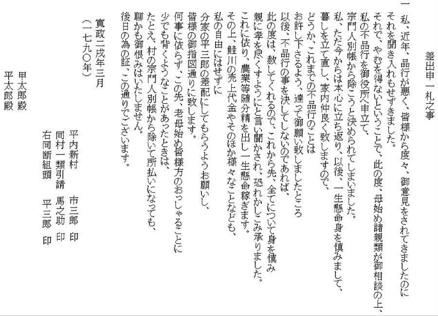 | 平田甲太郎家文書<寛政2(1790)年 所払い回避の反省文> 文書№691 | |||||
