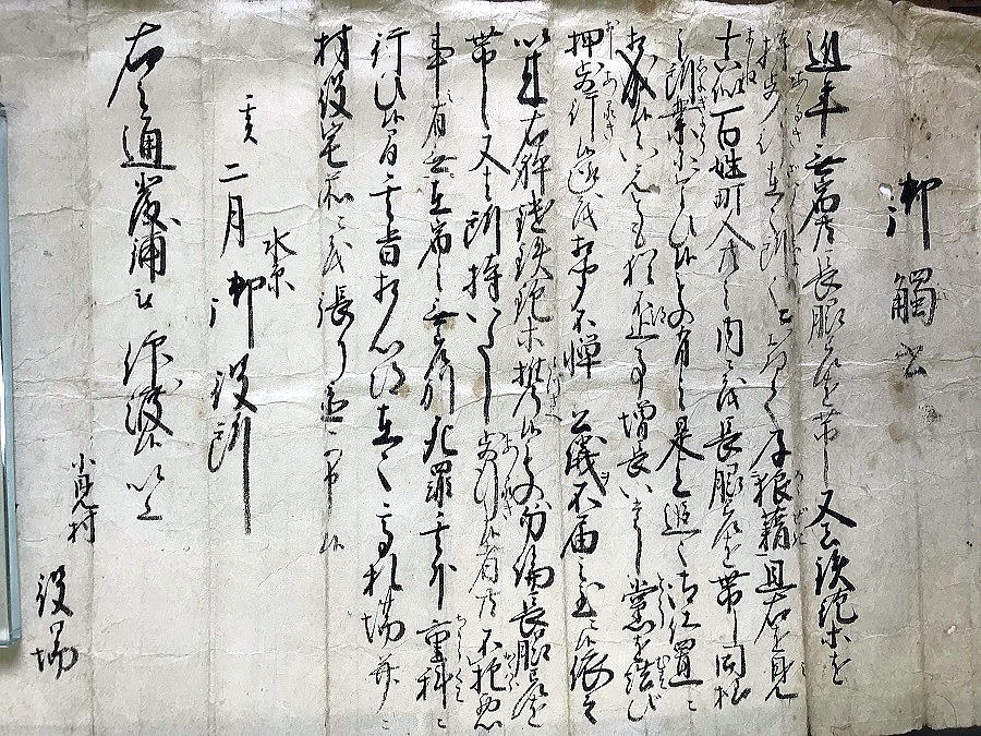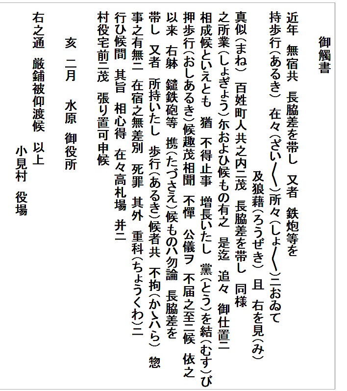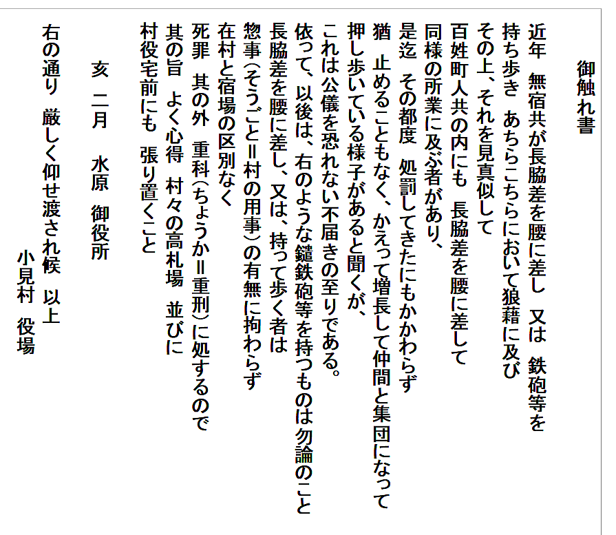 | 平田家文書№741「水原代官所の御触書」解説 無宿人対策について 江戸時代も後半になると、幕府は無宿人対策に手を焼いています。 安永7(1778)年の江戸無宿人大量逮捕、佐渡送りの事件はよく知られています。「郷土史辞典 新潟県 昌平社1979年刊」によれば、幕末まで1876人もの無宿人が江戸や大阪から送られ、佐渡金銀山の水替え人足として働かせたとあります。 無宿人は、戸籍簿である「人別帳」から外された者。その原因は、所払いの処罰、勘当、家出、逃亡、様々だったようです。身元が不確かであれば定職にもつけない浮浪人。 それらが徒党を組み、長脇差などを腰に差し、中には槍・鉄砲まで持って、博奕や乱暴のやり放題。百姓町人の中にも、その仲間に入るものが出てくる。まるで渡世人のヤクザ映画、国定忠治の世界です。その増加は、社会の治安を不安定にしたでしょう。ネットで調べると、同じような内容の御触書が、時期を別にして、各地に出されていたようです。 御触書について 御触書は、幕府で作成され、各地の代官所へ送られました。「村上町年行事所日記」には、幕府の文書が宿継ぎで到着したので代官所へ届けたという記述があります。宿継ぎは、宿場から宿場へと物品を送り継ぐ仕組みで、公用は基本無料で送るのが宿場の義務です。時には、旅の途中難儀な目に遭った人も宿継ぎで家へ戻したという記録もあります。 この御触書もそのようにして水原代官所に届き、庄屋達を集めて伝達したのではないでしょうか。 高札場だけでなく、村役宅前にも張り出せとあります。庄屋宅前とか役場前でなく村役宅前ということは、組頭や百姓代の家の前にも張れということでしょうか。代官所から示された一枚を書き写して必要枚数にしたのでしょう。「鉄砲」の砲は、当時は火へんの「炮」を書きますが、原文が2ヶ所とも金へんの「鉋」に見えるのは、書き写した人の勘違いのような気がします。 そもそも水原代官所の役人はたったの5人という記録があります(租税大学校「租税ジャーナル」2013年)から、代官所で管内庄屋数分を用意したとも思えません。庄屋を集めては、幕府からの一枚を書き写させ、「厳しく言い渡して」持ち帰らせたのかもしれません。どうもそんな気がします。 御触書の漢字には、一部、読みがながふってあります。有名な慶安の御触書も、漢字のほとんどに読みがながふってありました。当時の読み物本などは、大部分ひらがなで書いてあって、多くの人はひらがなは読めたようです。それで、難しい漢字には読みがなをふって、だれにでも伝わるようにしたのでしょう。 もっとも、当時のひらがなは、いわゆる万葉仮名のような漢字を崩した文字で、今の私たちには漢字以上に読みにくい文字です。 蒲原・岩船郡大騒動について 郷土史では「野口騒動」という言い方もされてきました。旧荒川町の野口新村と旧中条町の菅田村で主導者が逮捕されたということで、「野口騒動」や「菅田騒動」という呼び方もされるようです。 騒動の様子は、次の図書に詳しくあります。 新潟県発行「新潟県のあゆみ」 p229 井上鋭夫著「新潟県の歴史」山川出版p197 両書とも、この大騒動に無宿人がかかわったという記述はありません。 御触書には年が書いてなくて、ただ「亥二月」とあるだけです。たまたま、この大騒動の文化11(1814)年が戌年で、その翌年亥年の早々に出された御触書ではないかと、筆者の単なる当て推量。 大騒動の年は、各地で一揆や騒動が起きています。我が関川村には波及しなかったとはいえ、騒動の前夜、大島村の芝居興行で不穏な動きがあったとの記述もあります。全体として不穏な空気が流れていたのでしょう。こんなとき、無宿者に騒動を起こされては大変と手を打ったのではないかと、そんな推測からです。「死罪」「重科」の語は重く大きく響いたでしょう。 |