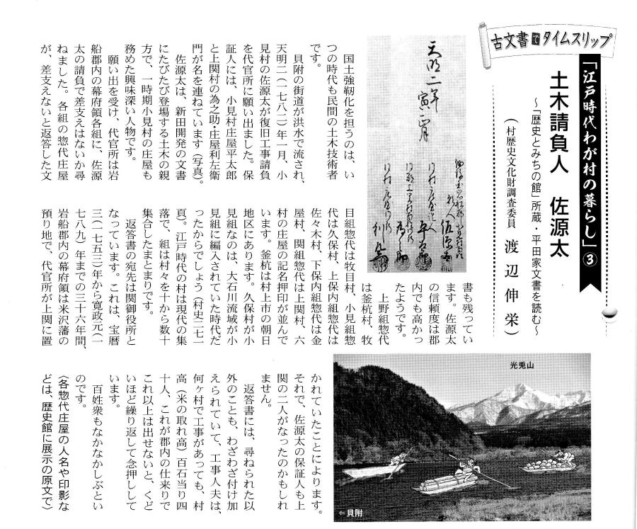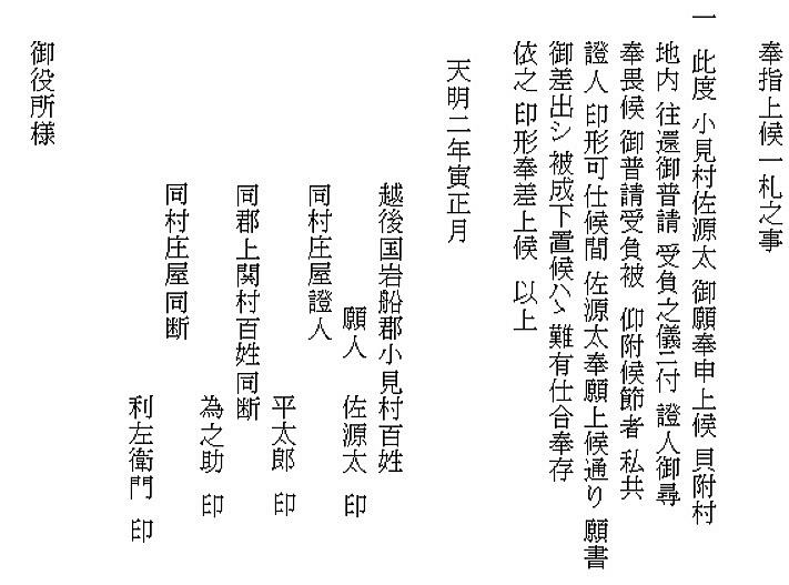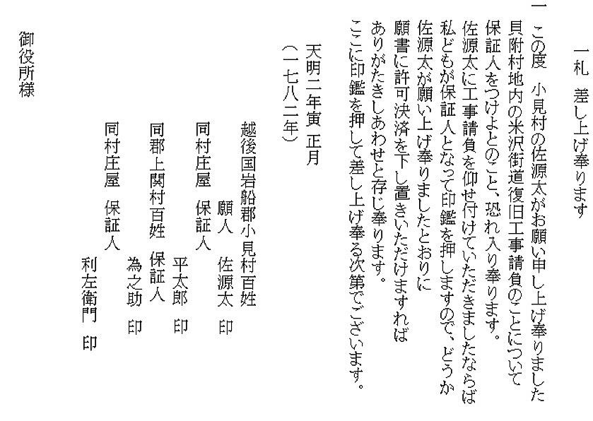 | <解説> 貝附(現村上市荒川地区)は、米沢街道が海岸平野部から関川村の盆地に入る入口で、両岸に山が迫る狭戸(せばと)になっています。そこの道路が洪水で流され欠損したため、復旧工事をすることになった際の文書が2通。この文書から、当時の公共事業工事請負の実際を垣間見ることができます。 ①の文書について 小見村の佐源太が貝附工事請負を願い出ました。代官所から保証人をつけるように言われたのでしょう。小見村の庄屋と上関村の二人が保証人になって佐源太と連名で工事請負の願書を提出しました。佐源太に工事を命じて下されば、この三人が保証人になりますと書いてあります。 差出し先はただ「御役所」となっていますが、次の文書で明らかなように、上関にあった米沢藩の代官所です。佐源太の地元小見村の庄屋の外に上関村の庄屋ともう一名が保証人になっているのは、役所の所在地だからかもしれません。為之助がどういう人物かは今のところ不明です。推測ですが、佐源太と同じに土木の親方的存在だったのかもしれません。 小見村庄屋の平太郎は、勿論、あの田麦堀割訴訟の平太郎です。 ②の文書について 佐源太に工事を請負わせることで何か不都合はあるかという役所からの問い合わせに対する、郡内各村からの回答書です。 水害被害を受けた貝附村から復旧工事の要望が出され、佐源太が請負を願い出たことが書いてあります。役所は、郡内各村に、佐源太に請け負わせてもよいか照会していて、一方的な上意下達では無いことが分かります。 実際の工事には、各地区村々からの人足提供が必要なので、それなりに気を使っているのでしょう。 各地区惣代にとっても、徴集される人足の数が一番の問題です。だから、佐源太請負で不都合はないと答えた後で、人足について念押ししています。従前どおり村高100石につき40人、それ以外は工事のある村で出す仕来りですと。文脈からは、何ヶ村で工事があったとしても、100石につき年間延べ40人が限度ですということでしょう。 御上に対して、はっきりともの申しているのは意外な感がします。 宛先の「関御役所」は、上関に置かれた米沢藩の代官所です。 宝暦3(1753)年~寛政元(1789)まで、関川村の大部分は米沢藩の預り地で、上関に藩の陣屋がおかれていました。その位置は、渡辺儀右衛門家の宅地内と考えられいます(村史260頁)。儀右衛門家は下関の渡辺三左衛門家の分家です。 署名の6名は、岩船郡内幕府領の各組の代表庄屋です。1番の上野組釜杭村は、現村上市朝日地区に釜杭の地名があります。3番の小見組惣代は、久保村庄屋になっています。これは、大石川流域が小見組に編入されていた時代があったからです(村史271頁)。小見組の大庄屋は代々平太郎家が務めていますが、工事請負の佐源太が小見村で、平太郎はその保証人になっているので、工事の影響の有無は久保村庄屋・半右衛門が代表となって答えたのかもしれません。 ③ 工事請負人の佐源太について 佐源太は、かつて上関の儀右衛門家に手代として奉公していたと書かれた文書(文書№593)があって、そこから推測するに、佐源太が工事を請負うに当たり、代官所のある上関を中心にした人脈があったのではないかという気がしてきます。もしかしたら、資金面でも、儀右衛門家が佐源太のバックアップをしていたのかもしれません。 貝附工事の前年天明元(1871)年に佐源太は、高田村と平内新村の地先の古川敷で新田開発の事業を始めています。両方の工事を同時進行させていますから、かなりの事業家だったと思われます。 新田開発が成功して、そこが後に小見前新田村になります(村史496頁)。その関係文書も5通(文書№545、624、654、695、734)見つかっています。 なお、この貝附工事より少し前、安永2(1775)年と安永4(1777)年、佐源太が小見村の庄屋を務めていたことを示す文書が2通あります(文書623、657)。前後の時期には、小見村庄屋平太郎名の文書もありますので一時的な就任だったのかもしれませんが、人望のある人物だったと思われます。 いずれ、佐源太関連の上記文書も紹介したいと思っています。なかなか興味ある人物です。 |