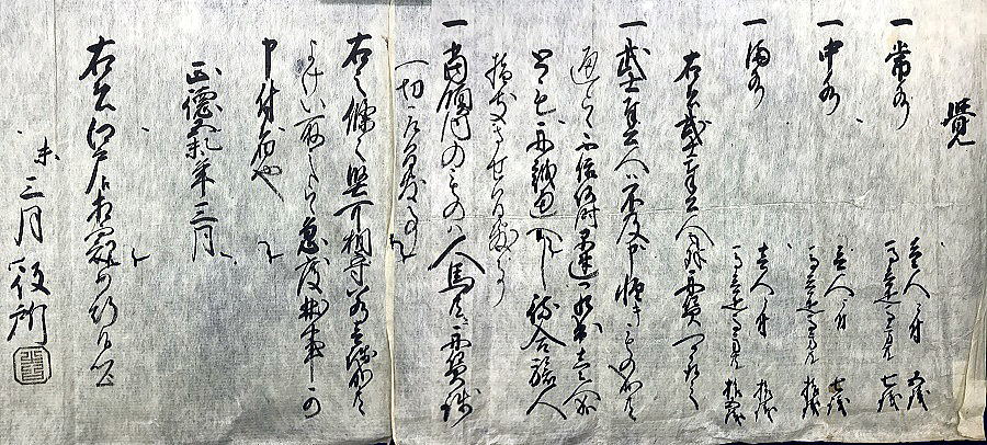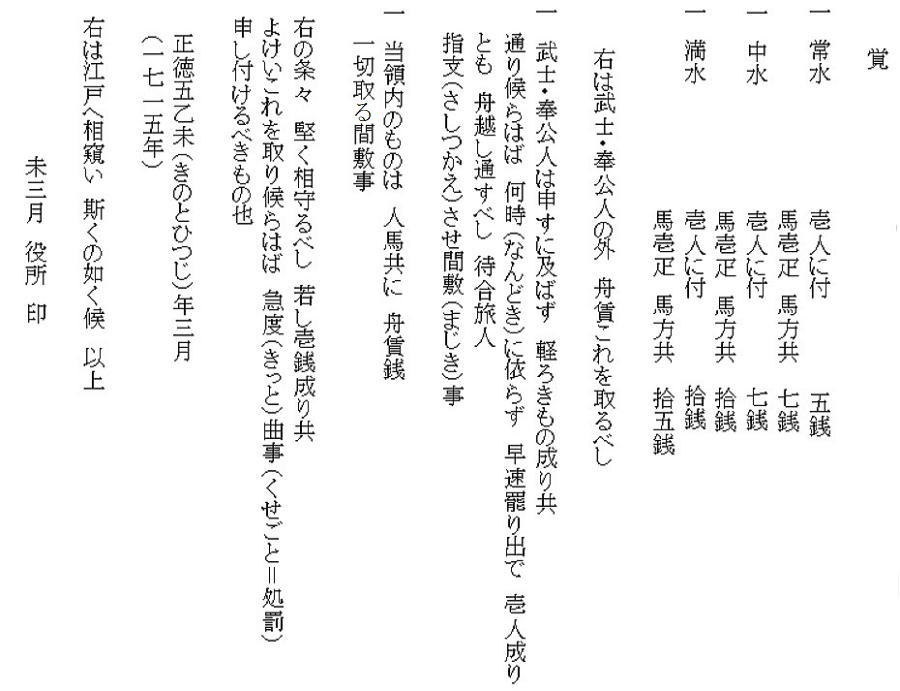 <解説> この文書は、「渡し舟の舟賃と運航についての定め」です。 1 この文書を出したのは? ただ「役所」と書いてあるだけです。 どこの役所からでしょうか。手がかりは正徳5(1715)年にあります。 宝永6年に村上藩が15万石から5万石に減封され、関川村のほとんどは村上藩領から幕府領になります。それもつかの間、3年後の正徳2(1712)年には、幕府領から館林藩領になります。 館林藩は、新たな領地となった越後国岩船郡と蒲原郡を管轄する代官所を海老江に置きました。よって、この文書の「役所」とは、海老江の代官所のことになります。 2 舟賃は、川水の量で変わる 常水、つまり平常の水量で、人一人、五銭。馬は馬方共に七銭。 それが、中水、満水になると、七、十、十五と割増しになります。 どの程度で中、満なのかは分かりませんが、まさか、危険な程度の大水では舟は出さないので、安全なぎりぎりの程度が満水で、その中間が中水ということでしょうか。 銭(せん)は一文銭のことで、一文(もん)と同じです。江戸時代では文が一般的になるようです。 幕末の万延元(1860)年、上関住人・孫三郎一行の伊勢・金毘羅参り「道中記」には、渡し舟賃は十六文~二十文とあり、150年弱で3~4倍になっています。年3%のインフレ率だと100年で3倍、ということは、江戸時代は順調な経済成長をしていたと見ることができるようです。 もっとも、幕末の開港以来諸物価は高騰したといわれているので、150年平均しての上昇では無いかもしれませんが、孫三郎たちの淡々とした旅の様子からは、庶民の生活に影響するほどの物価高騰があったようには思えません。開港直後(2年後)なので、まだそれほどの影響は生じてなかったのかもしれません。 3 無料で乗れるのは? 「武士と奉公人以外、舟賃を取るべし」とあります。つまり、武士とその奉公人は無料です。 身分社会で武士は、政治・行政の公務を担う特権階級です。武士は必ず主人持ち。主人は領主で、公的存在そのもの。その主人の命令で行動するのが武士。だから、武士の旅は常に公務。という理屈になるのでしょう。 また、「領内の者は人馬共に舟賃を取間敷事」とあります。間敷(まじき)とは禁止の意味です。 渡し場は幕府や領主が定めた公設で、経費は地元の村が負担しています。船頭の手当も村から米などで出していました。東海道などの旅人が多い所では舟賃収入があてにできるので、民間業者が請け負う形態もあったそうです。しかし、主街道以外の村道では、舟賃収入は、そうあてにはできなかったでしょう。 4 「舟が出るぞー」はなかった 「武士奉公人はもちろん身分の低い者でも、通る人がいたら、いつでもすぐ出てきて、一人でも舟を出すこと。旅人を差し支えさせてはならない」とあります。定刻、あるいは乗る人がある程度集まったら舟を出すのではなく、いつでも、「船頭さん、頼む」「あいよ」と、こんなふうだったようです。まるで都会のタクシーです。 5 一銭でも余計取ったら処罰する 「きっと曲事(処罰)申付けるべきものなり」と厳しい規定です。こういう禁止事項は、それをする者がいるから定めるものです。人・物の交通を盛んにしなければ経済は発展しません。だから領内の安心安全な交通政策は領主の務めです。 江戸幕府は、街道を整備し、宿場の制度を設けて人流物流を盛んにしました。時々天災による不況はあったものの、おおむね順調な経済成長を果たせたのは、交通政策の成功が大きな要因だったと思われます。 6 江戸に伺って定めたものだ 代官所が勝手に決めたのではないと、わざわざ断っています。この時の館林藩主は、第6代将軍徳川家宣の弟、松平清武。親藩中の親藩。藩主は江戸に居て藩政の中心は江戸にあったのでしょう。代官所の役人にしても、我が殿は将軍(この時点では前将軍)の弟で本拠地は江戸だという意識があったのではないでしょうか。 7 荒川に橋が架かったのは、いつ? 陸地測量部(現在の国土地理院)の地図で最も古いのは大正2(1913)年の地図になります。そこには、現在の国道113号線に該当する道路に全て橋が架かっています。山形県に通じる旧米沢街道は、明治に入って大改修が行われたからです。 荒川の左岸と右岸をつなぐ現在の温泉橋、小見橋、高田橋が架けられたのは、それよりもずっと後になります。 温泉橋=大正11(1921)年 小見橋=昭和3(1928)年 高田橋=昭和8(1933)年 「ふるさと百年史」(平成十六年・関川村発行)から | |||||