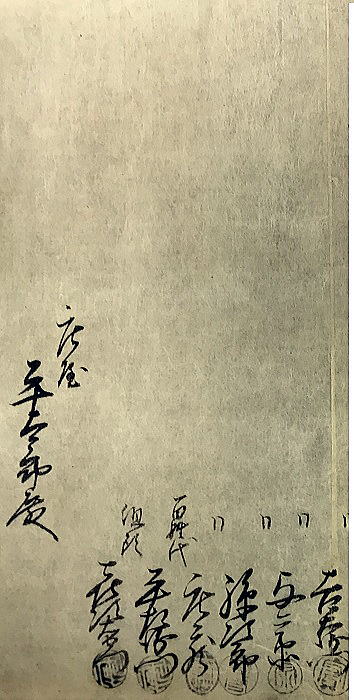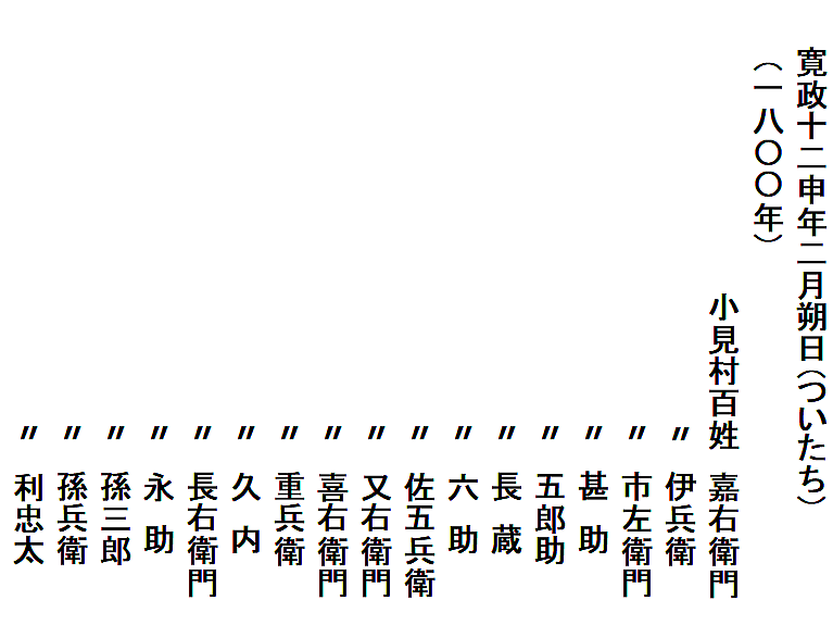 | < 解 説 > 江戸時代は、町も村も自治が基本です。 とりわけ、村の自治は鎌倉時代に始まったと言われるくらいの伝統と歴史があります。まだ、兵農が分離する以前の時代、リーダーを中心に、百姓たちが話し合って決まりを作り、運命共同体の村を保持してきた。そうやって、戦乱の時代も乗り切ってきたのです。 江戸幕府の政治は、そういった村の伝統的自治の上に成り立っていたといっても過言ではないでしょう。 自治の象徴が自主制定の法律。「村定(むらさだめ)」「村極(むらぎめ)」「村掟(むらおきて)」などと呼ばれ、罰則も規定されています。 様々な決まりの中でも、とりわけ共同体から排除すべきは、博奕と盗み。 博奕については、文書冒頭、「博奕は言うまでもなく」とあっさりとしています。8年前の寛政4年(1792)に、博奕禁止請書を作成したので、「言うまでもなく」なのでしょう。⇒こちら 盗みについては、まず、雑木林をわざわざ特記している。おそらく、その盗伐が多かったからでしょう。 村定の体裁は、庄屋宛の連判状になっています。皆で決めた決まりをしっかり守りますと庄屋に対して誓約した形をとっています。 何やら、学級会で学級の決まりをつくっていたことを思い出します。担任と学級全員に対して、学級員一人一人が決意表明をしたりしたことを。 それはともあれ、庄屋も含めて、ここに名を連ねている24名の人たち、多分、現代の家に繋がる人たちも多いのでしょうね。遠いようで、江戸時代は案外近いのです。 |