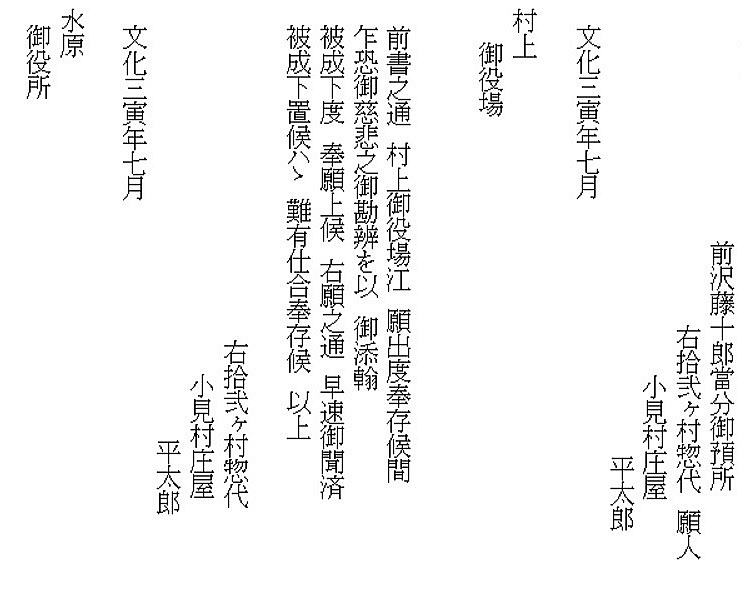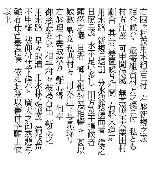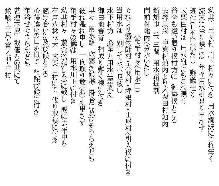 | 《解説》 文書② 新規堀割用水路出入 村上藩宛訴状 (文化2年7月 文書№543) について <新規堀割用水路出入について> 出入とは訴訟のことです。 この文書の時代よりずっと以前、寛永年簡(1624~)に、村上城主として入封した堀丹後守直寄が、光兎山の北麓を流れる藤沢川(女川の支流)の水を門前川(三面川の支流)へ落とすため、分水嶺の尾根を掘り割りました。現代の地名をとって「田麦堀割(堀切)」と通称されています。(現地の様子は、2017年の「山歩紀行」にあります。⇒こちら )直寄の直接の目的は村上城の堀に水を引くためでしたが、当然、余水は灌漑にも使われていました。 それから約180年近く経った文化3年、その田麦掘割が拡張されたことで、この訴訟が勃発しました。 訴えたのは小見村庄屋・平田平太郎を代表に、朴坂・高田・小和田・若山・平内新・桂・新保・上野山・小見・瀧原・大島・上野新の天領(幕府領)12村。 訴訟の相手は、大栗田・中束・蛇喰・中村・宮ノ前の村上藩領5村。大栗田村は門前川の最上流部谷合にあり、他の4村は藤沢川と女川の流域にあります。 直寄の時代は、関係領域全てが村上藩領でしたが、この訴訟の頃は、関川村の大部分は天領になっていました。 それでなくても貴重な用水を上流で他地域に取られてしまうのだから、大変な事態です。訴訟の意図はよく分かります。 それにしても、新規掘割による用水増の恩恵を受けるのは門前川下流の村々なのに、なぜこの5村が相手なのか。まして、中束村以下は水を取られる側なのになぜ訴えられたのか。そこが不思議です。 それに、訴訟人の側には、女川流域ではない村も数村あって、そのうち大島村は、荒川対岸の村ながら女川の側にも耕地があったので女川用水組合に入っていたということのようですが、その他の村にも、出作地があったのか、それとも小見組としての連帯だったのか。 この掘割拡張による訴訟関係と思われる文書が、文化2~4年にかけて5.6通あり、それらの文書と、「神林村誌」「村上市史」掲載の史料を読み合わせることで、この訴訟の全容が見えています。 <この文書の内容について> この文書の本文は村上藩宛の訴状ですが、末尾に後書があって、訴状部分を含むこの文書全体は、幕府水原代官所へ宛てて、添翰(添え状)を要請したものであることが分かります。 他領藩庁への訴状には、自領支配代官所の添え状が必要でした。 当然、代官所はそれなりの事実調査を行い、訴えの妥当性を判断して添え状を出します。 「神林村誌」に、これの正式な訴状が載っていて、被告の大栗田等五村の反論も載っています。訴えが村上藩に上り、被告村は藩に命じられて返答書を提出して反論したことになります。 ということは、代官所がこの訴状の妥当性を認め、添え状を出したということです。 代官所は訴状の妥当性を判断するために、原告代表の平太郎と事前にやり取りするはずです。文中添削の跡があるところから、この文書は、代官所とのやり取りの中で加除訂正が行われたものと考えられます。 そもそも、幕府領内の川水(水田用水)を不法に取られたとなれば、本来は、代官所が先頭に立って調査し、事実であれば幕府へ報告して対処すべき事態です。 それをしないで、平太郎を前面に立てて、代官所が後ろに回っていることが、この事件の異様さを表しています。それよりも何よりも、犯人は村上藩であることが分かっているのに、あえて大栗田村を犯人にして訴えていること自体、異様です。 この異様さは、すべて、幕府と村上藩の関係から来ています。藩主は江戸で将軍間近に仕える中央官僚の奏者番。幕府領を管轄する勘定奉行の後輩同僚です。地方の一代官所など手も足も出せない存在。まして、水原代官の前沢藤十郎は、一時預かりのいわば委託管理者。村上藩も恐らく高をくくっての無断工事だったのでしょう。 「オレがやらずばダレがやる」 これが平太郎の心意気だと思います。 藩を訴えることができないのであれば、農民同士の水争いにして、幕府へ訴えよう。犯人はだれであれ、幕府領の水が不法に盗まれたとなれば、幕府も無視はできまい。平太郎は、大胆不敵な相当の策謀家です。 さて、代官所が添え状を発行するにあたり、上部機関である勘定奉行所へ伺いを出しているはずです。これにより、村上藩の無届工事と平太郎の訴訟意図等、すべて勘定奉行所は把握しているはずです。本心は、有耶無耶に終わらせたかったでしょうが、平太郎の訴えを抑え込む理由がありません。 多分、村上藩が平太郎をうまくなだめてくれることを期待して、代官所の添え状発行を許可したのでしょう。 期待に反して、村上藩は平太郎の訴えを撥ね付けます。すべては、村上藩のボタンの掛け違いから、ことは大事件になったのです。 |