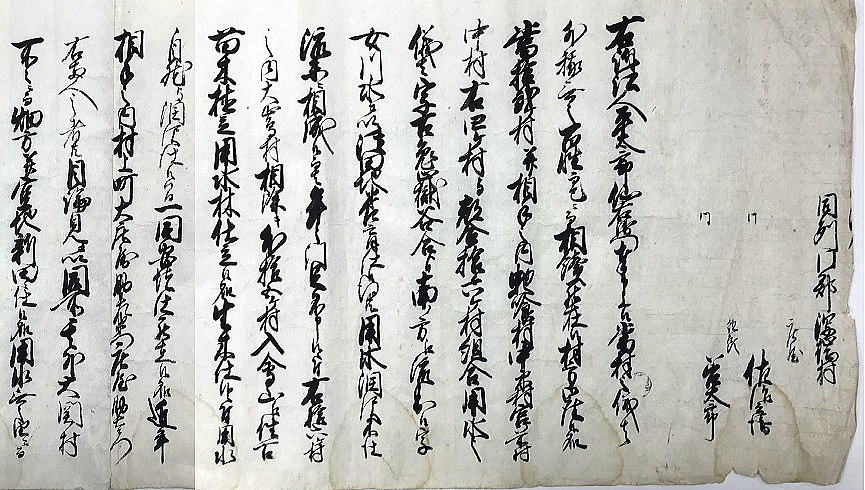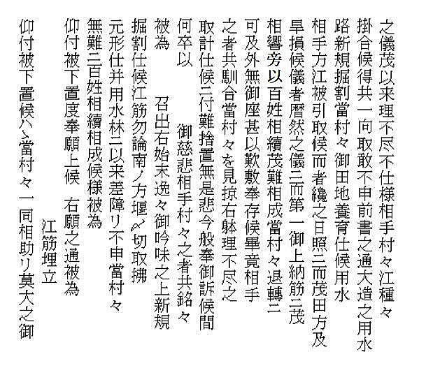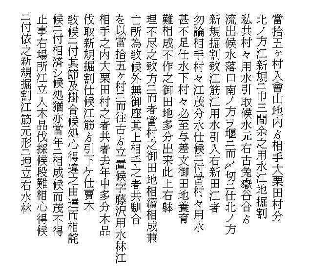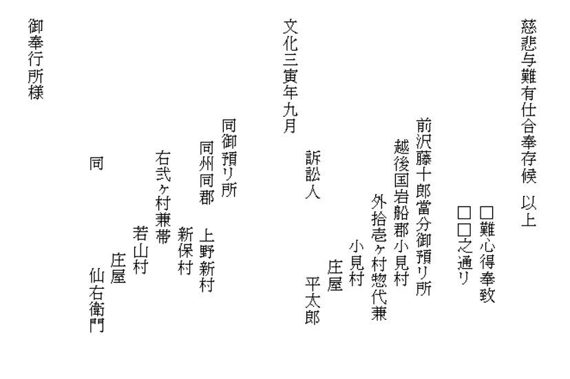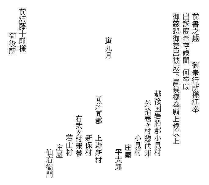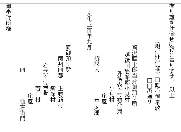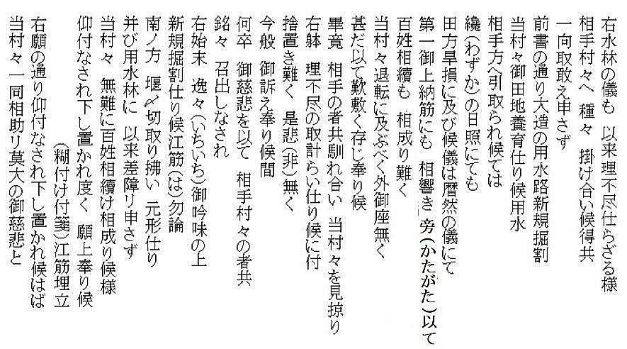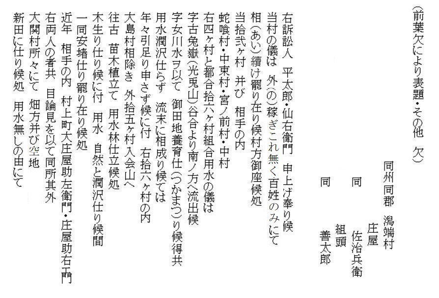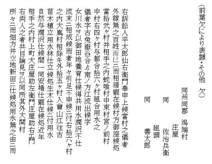 | 《解説》 文書③ 新規用水路掘割出入(訴訟) 幕府勘定奉行所宛 訴状 (文化3年9月 文書№766) <前葉の欠落について> この文書の前葉は欠落していますが、欠落部分の内容は別の文書で確認できます。 9月のこの訴訟は、幕府評定所から現地熟談と裁定されて差し戻しになります。それが破談となって翌年1月に再提訴しました。その際の訴状(文書№732)の内容が、9月訴状と同じだからです。 再提訴の1月訴状によれば、この文書の欠落部分には、原告(訴訟人)12村名と代表の小見村庄屋平太郎・若山村庄屋仙右衛門の名が書いてあり、続いて、被告(相手方)19町村名と村役人の名が列記されています。 この文書の始めにある「潟端村の庄屋・組頭」が、列記された被告の最後ということになります。(原告・被告の町村名は地図参照) <7月の村上藩宛訴状(文書№543)との違い> 7月の訴訟は、藤沢川の水利に関係ない者の言いがかりだと一蹴されました。それならばと幕府へ訴え出たのが、この9月訴状です。7月訴状とは、訴えの内容が少し変更されています。 ① 堀割の犯人を大栗田村から村上町の大庄屋助左衛門・庄屋助右衛門に変更 ② 掘割の理由は、村上町等で畑や空地を開田して、その用水が必要だから ③ 掘割箇所の下流で藤沢川を堰で締め切ったこと ④ 大栗田村は、用水林の木を伐り、堀割の用水路を使ってその木を流していること 「村上町年行事所日記」には、村上町は、御城の堀の補強と町の中の新用水路の開削に大勢の人足を負担していて、堀割そのものの工事人足の負担は書いてありません。 おそらく、堀割工事の人足は大栗田村が負担したのでしょう。それで、平太郎は、7月訴訟では犯人は大栗田村としたのだと思います。真相を知っている平太郎のジョブかフェイント、村上藩の出方を伺ったのです。 そして、この文書では、より真相に近くした内容です。いよいよ真っ向勝負だと、そんなつもりでしょう。事の真相がほぼ書き込まれています。ただし、真犯人は村上藩だということだけは、ぼかしてあります。 <平太郎の戦略> どうしたら無法に引き取られた水を取り返せるか、平太郎は考えに考え抜いたのだと思います。 単純に村上藩の無法を幕府に訴えたらどうなるか。田麦掘割の水は元々御城の堀の用水。城は軍事要塞。百姓が口出す余地はありません。無視されるか、悪くすれば厳罰もの。たとえ藩の無法だったとしても、幕府と藩の問題であって、仮に藩が罰せられたとしても、水を取り返せる保障はありません。 百姓同士の水争いなら堂々と訴訟を起こせます。何しろ、幕府領の水田用水を無断で取られたのです。しかも、取った相手は19町村。大量取水です。勘定奉行所としては、自分の管轄領域のこと、年貢上納にも響くと言われてはなおのこと、無下に扱うわけにはいきません。平太郎の訴えを無視すれば、無断取水を黙認したことになります。それは絶対にできないはず。 平太郎はそこまで読んで、勘定奉行所へ訴え出たのでしょう。 <江戸への訴訟> それにしても、江戸への訴訟。並の百姓が決断できることではないでしょう。江戸のこと、幕府の役所のこと、裁判の仕組みのこと、相当精通していなければ、そうそうできることではありません。 村上藩にしても、小村の百姓庄屋がそこまでやるとは思ってもいなかったでしょう。 「広報せきかわ」(令和3年10月号)の「小見と海老江の意外な関係」で紹介したことですが、平太郎は、水原代官所管内の年貢米納入組合の責任庄屋の一人でした。彼らは、交代当番制で、海老江・新潟・江戸に長期出張し、あるいは千石船に乗り込んで、江戸の幕府御蔵に年貢米が完納されるまでの管理監督を担っていました。 平太郎が海老江湊詰当番だった文書は残っていますが、江戸に出張した記録はありません。しかし、交代制ですから、江戸長期滞在当番に当たったことは十分ありえます。それも、一度だけということではなかったでしょう。 赤谷村庄屋三助が、4月から12月まで江戸出張滞在した記録は「関川村史」と「郷史料集五」にあります。これくらい長期に江戸滞在していたからこそ、幕府への訴訟といった思い切った手段に打って出られたのだと思います。 <被告19町村の反論> 広報誌には、4組に分かれて反論書を提出と書きましたが、実際の文書は、現地5村、神納3村、門前川流域12村(大栗田村は重複)の3通で、その内、門前川流域町村の反論が、村上町とそのほかの町村とで内容を別にしています。 どの反論も、犯人が村上藩だということは隠しています。 藩がそれを厳しく否定している以上、藩の領民である自分たちが真実を言うことはできません。それが言えさえすれば、話は簡単。平太郎の訴えそのものが的外れ、自分たちは関係ないで、終わりです。あれは村上町の茶畑を水田に切り替える用水のために、藩が堀切分水を拡張したのであって、自分たちは全く関係なく、従来通りの利水をしているだけだと。村上町以外の18町村は、平太郎