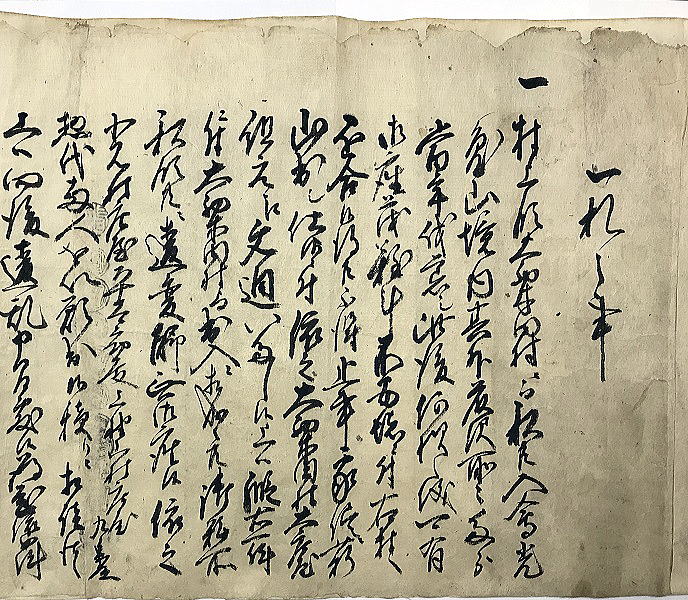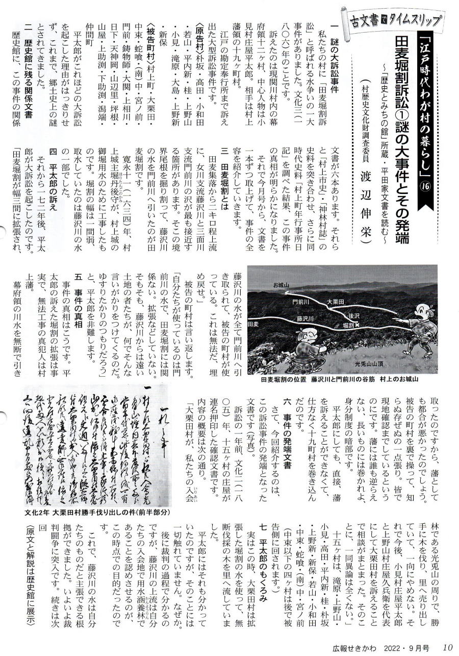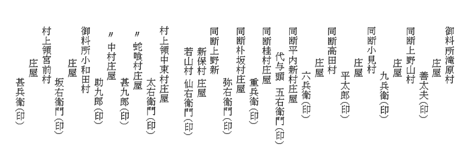 | 《解説》 文書① 大栗田村我儘(勝手)伐り出しの件 連判状 ( 文化2年8月 文書№529) 文化3(1806)年の田麦堀割拡張にかかる一大訴訟事件は、この文書から始まった 訴訟を起こすことになる前年の、この年(文化2年)、田麦堀割の尾根を挟んだ反対側(北)にある大栗田村が、越境して、15ヶ村の入会山で勝手に木を伐り、山出し、つまり里へ売りに出した。これは無視できない。 ということで、15ヶ村の庄屋が、今後の大栗田村との交渉・訴訟に力を合わせると念書を交わした。それがこの文書で、15ヶ村の内訳は、幕府領(御料所)の11ヶ村と村上藩領(私領)の4ヶ村。(村上藩領時代は、女川組、あるいは小見組と呼ばれた地域で、関川村になる以前の旧女川村にほぼ該当する。) ところが、残る訴訟関係文書5通を読むと、この後、事件はとんでもない方向に拡大している。 大栗田村の薪の伐り出しは、田麦堀割を無法拡張して新規に作った用水路を利用していた。その上、この念書で同意した村上藩領4ヶ村(中束、蛇喰、中、宮前)は、大栗田村の伐り出しを承知していて、それを幕府領11ヶ村に知らせずにいた。 ということで、幕府領11ヶ村に大嶋村を加えた12ヶ村は、大栗田村と村上藩領4ヶ村の5ヶ村を相手に、村上藩へ訴え出ることになる。 その時には、単に入会山だというのではなく、女川の水は、最初の念書に署名した15ヶ村に大島村を加えた16ヶ村の用水で、新規堀割で水を取られた藤沢川の上流は入会用水林だということになっている。 それが、文化3年の訴訟事件の始まり。 ことは、村上藩への訴えでは収まらず、幕府への訴訟となる。その上、相手方(被告)は村上藩領の19町村にまで拡大する。 この事件を詳しく調べていくと、後々に判明するのだが、訴訟方(原告)は、どうやら、大栗田村の勝手伐り出し事件を利用して、藤沢川の上流は自分たちの用水林だと主張し、それを大栗田村に認めさせたらしい。だから、藤沢川の水について訴える権利があると論理立てた。そもそも、その論拠に無理があって、この事件が混迷することになる。おそらく、中束村はじめ4村の離反もそれが原因のようだ。 いずれにしろ、この文書の、無法伐り出し事件から、一大訴訟事件が始まる。首謀者は小見村庄屋平太郎。 <「田麦堀割訴訟事件」の複雑さについて> 「村上新聞夏季特別号」に、この事件の全容は一通り紹介した。⇒こちら しかし、単純な事件ではないため、事件の細部全てを記述することはできていない。 これまで、この事件が郷土史上の謎とされてきたのは、その複雑さ故だ。 何が、この事件を複雑にしているのかというと、 ① 実際に堀割を無法拡張したのは村上藩なのに、藩を訴えるのではなく(それはほとんど不可能なため)、百姓同士の水争いの形で訴訟を起こしたこと ② そのため、被告の町村は実際の当事者ではなく、常に裏で村上藩の指示を受けながら行動していること ③ その村上藩の方針が一定していなく、右往左往の体で対応が変動していること ④ 平太郎はじめ原告のほとんどの村は、藤沢川の水利権に無関係であること ⑤ そのため、平太郎は、藤沢川の上流は自分たち15ヶ村の用水林であると主張したものの、その論拠には無理があること ⑥ 当初は用水林組合として一味であったはずの中束村以下4ヶ村が原告から外れ、逆に被告に回されてしまったことで、平太郎の主張が崩れたこと ⑦ 平太郎が何のためにこの訴訟を起こしたのか、その真意が、原告村々にも理解されていないこと ⑧ 幕府領の川水を無断で引き取られたという訴えは、幕府にとっては看過できない事態で、平太郎の訴えを無碍にはできない。しかし、幕閣の有力大名である村上藩主に対し、水原代官の前沢藤十郎は力なく、幕府も藩主に忖度して有耶無耶に始末したがっている。この点に、この事件の最大の矛盾と非条理があること などがあげられる。 封建身分制度の中での、どうにも後味の悪い、すっきりしない事件。 ただ、そんな時代状況の中でも、平太郎はどう戦い、何を勝ち取ったのか、これが、この事件の見どころ。 <歴史館に保管されている関係文書について> 次の6本の文書が、歴史館の平田甲太郎家文書の中にある。 ①大栗田村我儘(勝手)伐り出しの件 連判状 文化2年8月 文書№529 ②村上藩宛 訴状 文化3年7月 文書№543 ③幕府勘定奉行所宛 訴状 文化3年9月 文書№766 ④代官所,、村上藩各役人宛 現地熟談破談届 文化3年11月 文書№747 ⑤幕府勘定奉行所宛 訴状 文化4年1月 文書№732 ⑥幕府勘定奉行所宛 訴状 文化4年4月 文書№698 村広報誌9月号では、この事件のあらましと、①の文書を紹介した。 今後、順を追って残りの文書の内容を紹介していくことになるが、限られた紙面の中で、細部に立ち入って事件の複雑さを浮き彫りにするのは無理かもしれない。それで、館内に展示の解説文書で補足していくつもりでいる。(この解説のこと) 更には、10月の講演会はじめ、いろいろな機会にこの事件の複雑さと矛盾や非条理、その