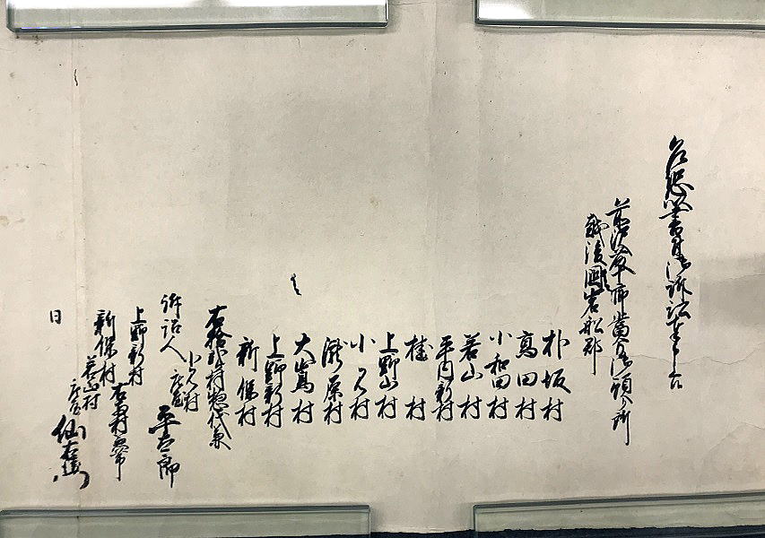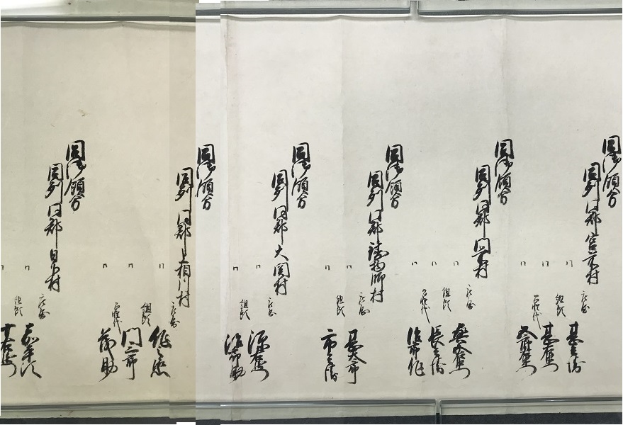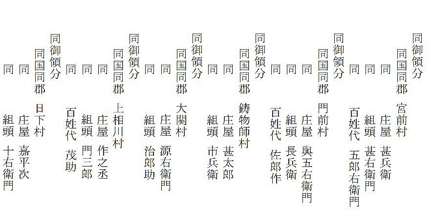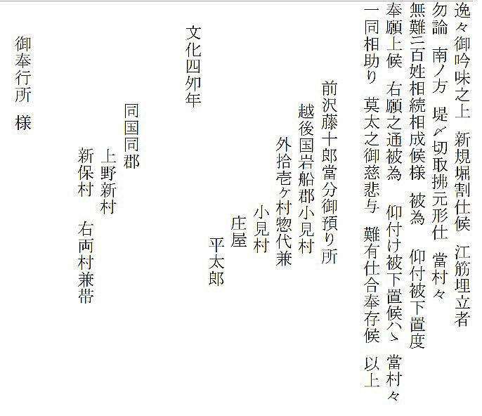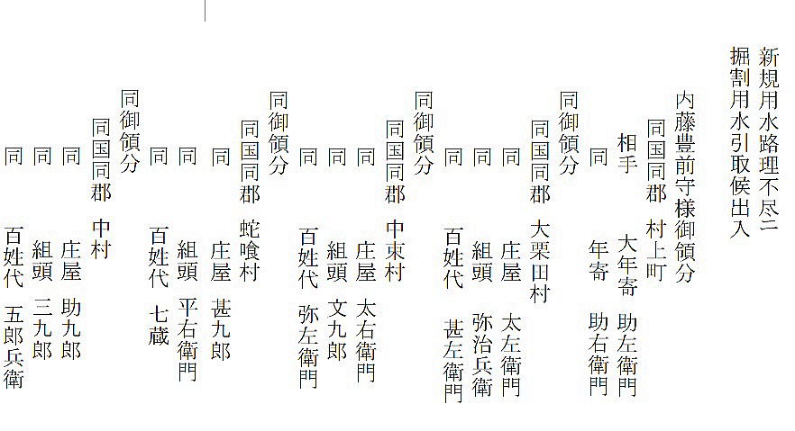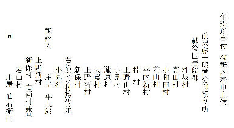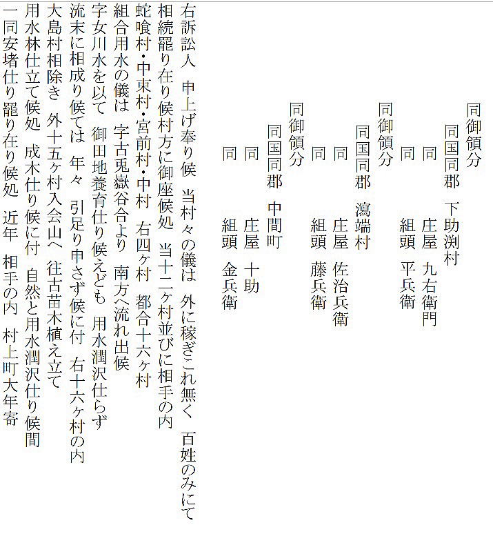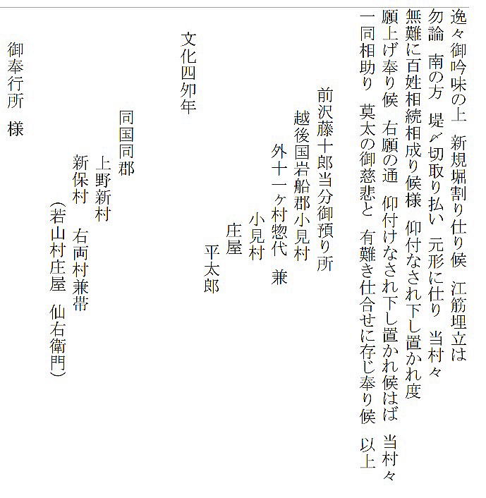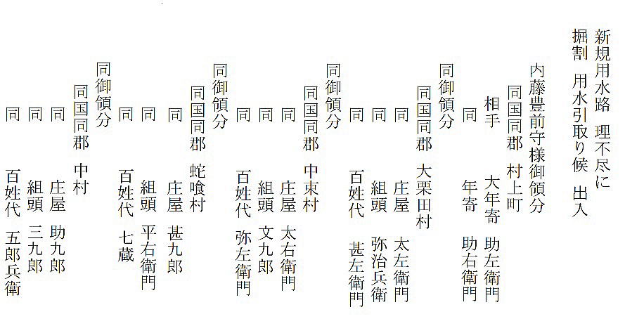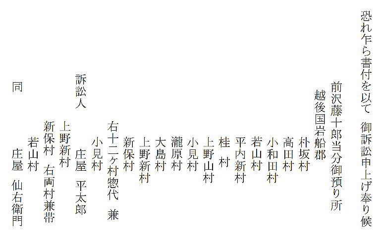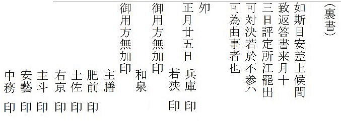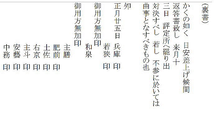 | 《解説》 〈文書の内容について〉 この訴状(文書№734)は、表裏共に写しです。表の訴状には、末尾の差出人名に「若山村庄屋仙右衛門」を書き落としています。読下し分には、( )で付け加えておきました。 訴えの内容は、当然ですが、文化3年9月に提出したものと、ほぼ同じです。若干の違いは、大栗田村の無断伐採の件と、被告の村が談合して自分たちを見下したことについては、削除。村上町の助左衛門・助右衛門を大庄屋・庄屋としていたのを大年寄・年寄に訂正したくらいです。 なお、9月の訴状には、後書きに、水原代官所宛の進達願がありましたが、今回は再提出なので、それは不要ということでしょう。直接、評定所へ提出しています。 〈破談から再提出までの経緯〉 村上市史や神林村誌によれば、次のような経緯です。 文化3年 11月13日 扱人の破談届(村上藩と水原代官所の担当役人宛) 12月17日 被告、江戸出府 12月26日 原告被告、評定所へ破談届提出(原告は仙右衛門) 文化4年 1月21日 原告、評定所へ訴状提出(平太郎出府) 1月25日 訴状に裏書裏判 訴状が受理された証しが、この裏書裏判ということになります。 通常は、原告がこの裏書裏判を持ち帰り、被告に見せて裁判開始となります。 しかし、村上藩の指示で被告は早々に江戸にいて、その場で裏書裏判を見せてほしいと要望しています。原告・被告、それぞれの公事宿の主人が扱人です。この二人が原告・被告・評定所の間に入っていろいろ交渉したことが、被告の一人山辺里村庄屋源蔵の日誌で分かります。 源蔵の日誌は、江戸滞在中の出来事を詳細に知ることができて興味深いものです。村上市史資料編掲載の釈文を意訳したものをHPの「文化三年田麦掘割訴訟顛末記」に載せてあります。目次のページから見てもらえれば分かりやすいと思います。 源蔵の日誌は、江戸時代の民事訴訟の様子がよくわかります。 〈裏書について〉 今回の訴状には、二通の裏書があります。 1月25日付けのものが、裏書裏判です。「目安」とは、訴状のことです。 ネットで「歴代江戸町奉行」を検索すると、文化3、4年当時の町奉行に根岸肥前守鎮衛とあり、裏書の「肥前」。同様に、寺社奉行は松平右京亮輝延で「右京」。勘定奉行は松平兵庫頭信行で「兵庫」。 源蔵の日記とも合致しています。 2月21日のお白州には、三奉行が順々に出座し、形式的な尋問を行ったことが書いてあります。但し、勘定奉行は、平太郎に対して突っ込んだ尋問をしています。しかも、ずいぶんくだけた口調です。これについてもHP「文化三年田麦掘割訴訟顛末記」に詳しく載せてあります。 もう一通、4月21日付。この日付は、原告・被告の合意書「済口證文」と同じ日付です。つまり、合意ができたので訴訟は取下げになったということです。調べてみると、判形を消すとは、そういう意味のことで、合意がなった際には、訴状に被告からの返答書を継ぎ合わせて返すのが、当時のやり方だったとのことです。 村上市史資料編の源蔵の日記は4月17日までで、「以下略」となっているため、この日以降の出来事は不明です。 「初判に持参すべし」とあるので、4月21日以後に合意成立による最終決着判決の場があったのかもしれません。それが初判だとすると、それ以前のはすべて調停に当たるのかもしれません。 村広報誌1月号に掲載の本文には、「御留役(調査官兼裁判官)」と書きました。源蔵の日誌からそのような役割に読めたのですが、現代の民事裁判に置き換えれば、御留役は調停官に当たるのかもしれません。ただし、実際の言動はとても調停官のイメージではなく、尋問官です。 |