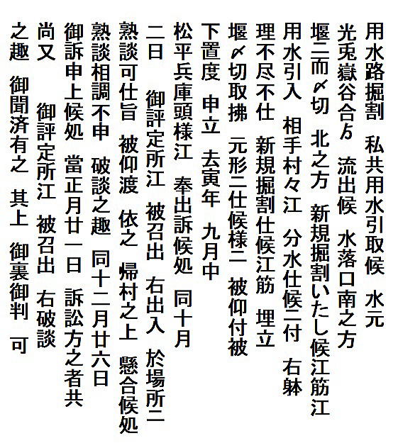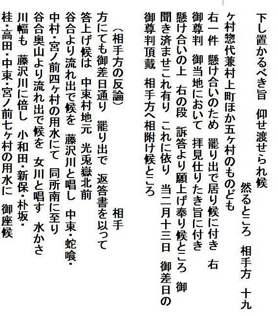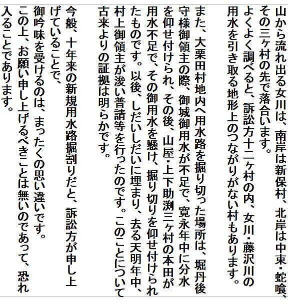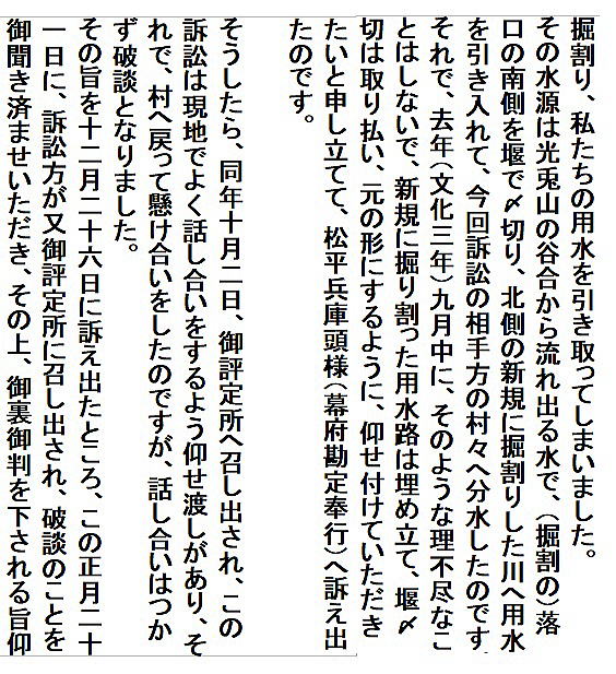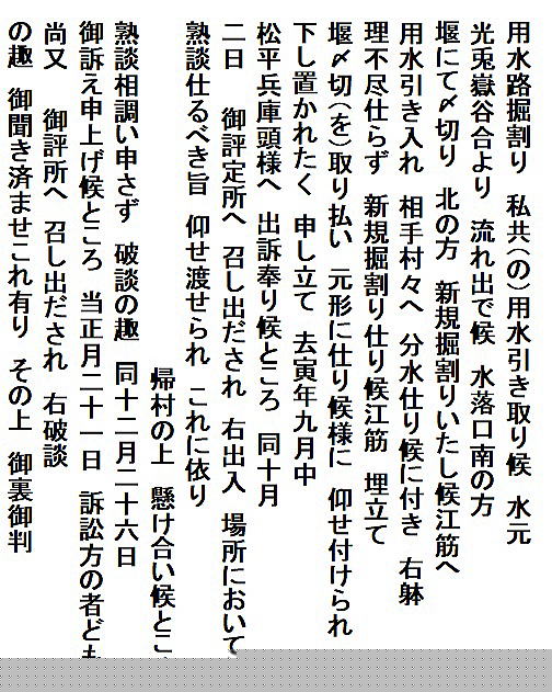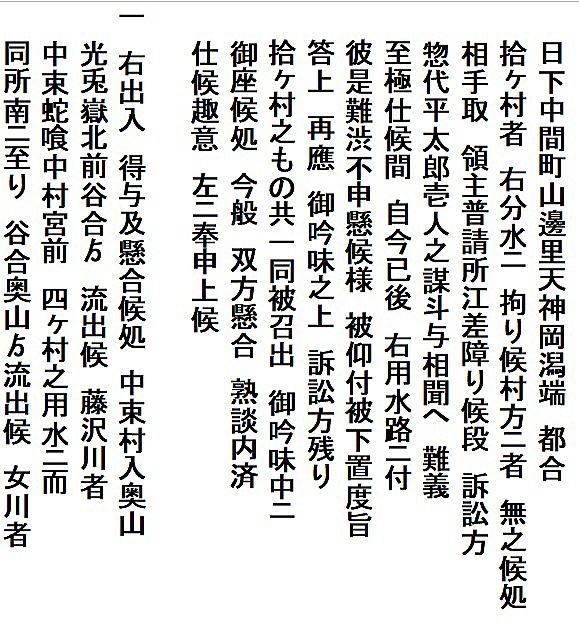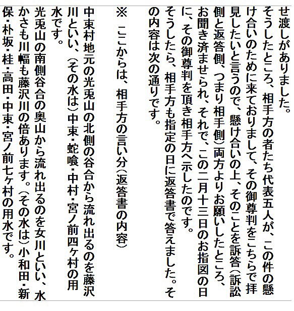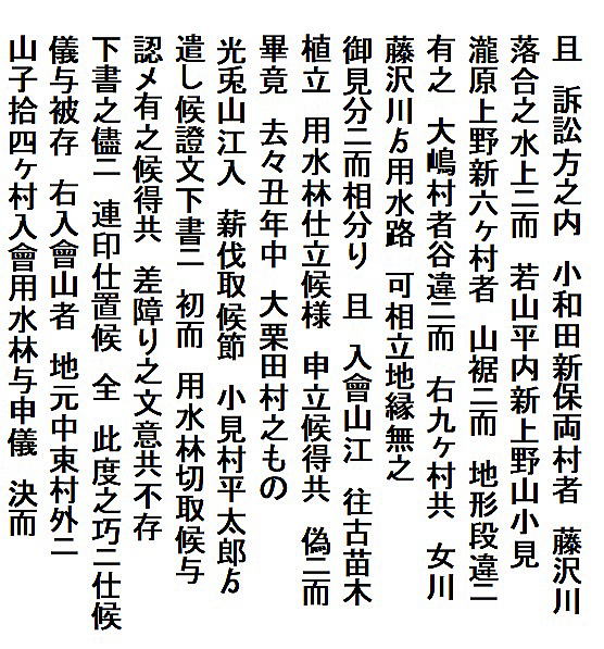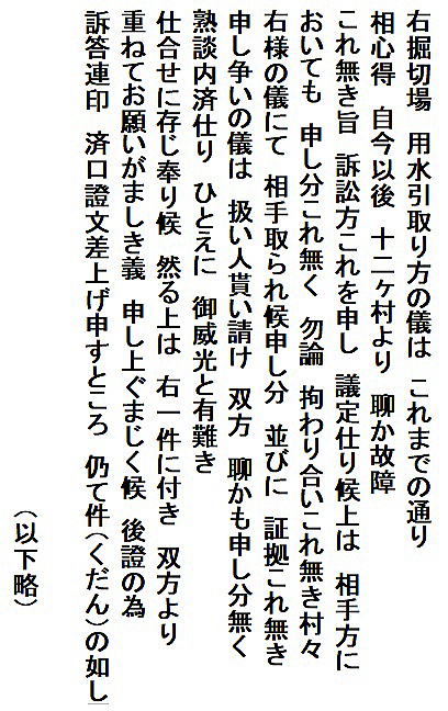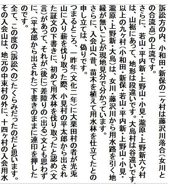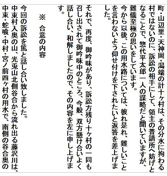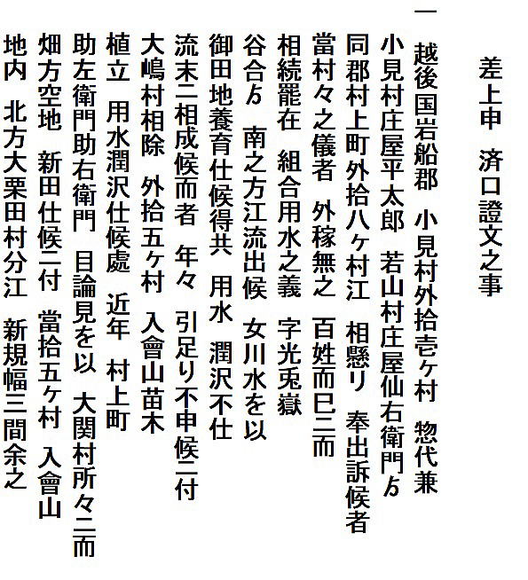 | 《解説》 済口證文は示談成立の証文です。訴訟方(原告)と相手方(被告)で取り交し、評定所(幕府の最高裁判所)へ一通提出します。 内容は大きく二段に分かれています。前段は、双方の言い分の確認。つまり、①これまでの訴状の内容と②それに対する返答書の内容です。両者の言い分を並べた上で、後段に③合意の内容が書かれています。言うまでもなくこれが最重要です。 ~文書の内容~ 長い文書ですが、結論だけ簡潔にまとめれば次のようになります。 ① 原告の訴え 村上町の助左衛門・助右衛門が畑等を新田にするために、藤沢川の上流に新規に幅三間余の用水路を掘り割り、その下流側を堰で締め切って、藤沢川の水を取った。その水を被告の村々へも分けた。これを元の形に戻させてほしい。 ② 被告の反論 ア 原告は、藤沢川の水に関係のない村々で、訴訟は、平太郎ひとりの謀略だ。 イ 藤沢川の上流は中束村の入会山だ。15村の入会用水林だというのは、偽りだ。 ウ 村上町の助左衛門・助右衛門が新田を企てたことは無い。 エ 田麦掘割は堀丹後守が造り、神納3村へも分水。十年前に補修工事をしただけで、新規掘割はしていない。 ③ 合意の内容 ②のアとエの通りなのに、今回、新規掘割ということで裁判を受けるのは、全くの思い違いだった。したがって、この堀切場の用水引取りはこれまで通りということで合意した。 関係ない村が被告にされたことや、証拠の無い言い争いは、扱人が預かることで決着した。 ~説明~ 合意の内容を読んでみて、びっくりです。全く、被告の言い分のまま。腰砕けではありませんか。思わず、「平太郎、どうした?がんばれ?」と言ってしまいたくなる内容です。 これは一体どうしたことか。こんなことがあるはずがない。もし、②の言い分が事実であるなら、そもそも、こんな大訴訟まで持っていけるはずがないのです。 ①の訴えが事実だからこそ、幕府も訴状を受理したのでしょう。では、なぜ、こんな合意内容になるのか。これはおかしい。裏に何かあるに違いない。 これが、「田麦掘割訴訟事件」の調査研究の動機でした。 歴史館保管の文書6通のほかに、「村上市史」「神林村誌」にたくさんの史料が掲載されていました。にもかかわらず、「関川村史」を含めた3市村史誌とも、真相の解明には至っていません。 今回の調査研究によって、ようやく真相が解明できました。 それで、まず、WEB上に調査研究の結果を公開しました。 次に、村教育委員会主催の講演会で概要を発表しました。 そして、関川村広報誌に、令和4年9月1日号から令和5年2月1日号まで、6回にわたって歴史館保管の文書を1通ずつ紹介しながら、事件の全容を説明してきました。 それらについては、下記のWEBページでご覧いただけます。 調査研究の結果は、⇒こちらから それを簡潔にした講演会用プレゼン(PDF)は、⇒こちらから 村広報誌連載記事と解説は、⇒こちらから |