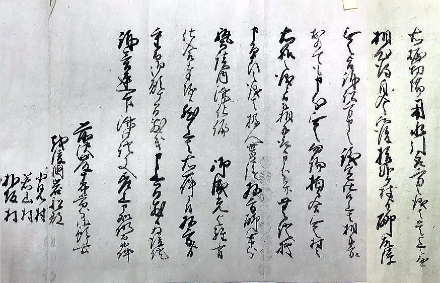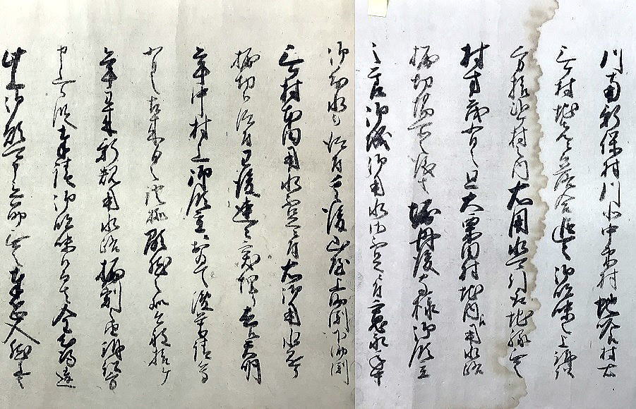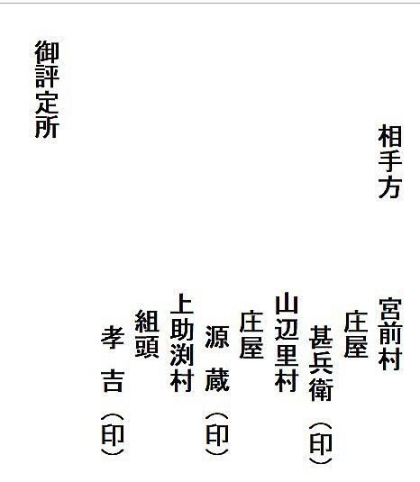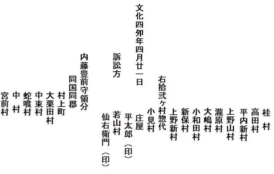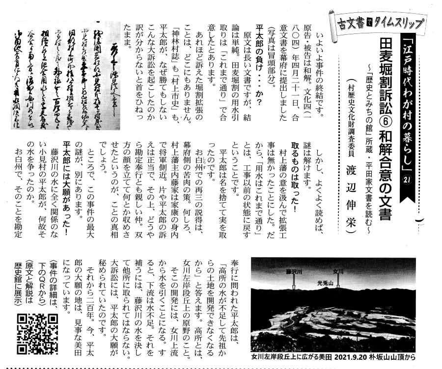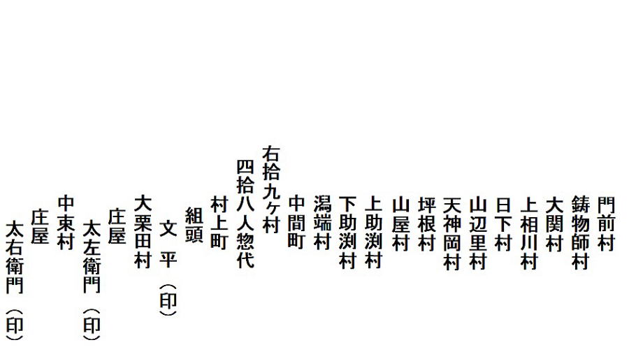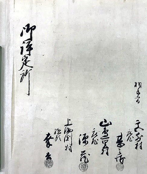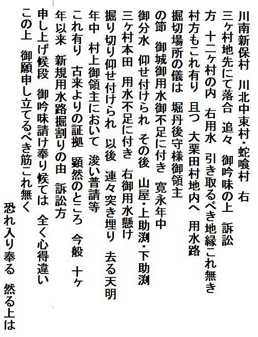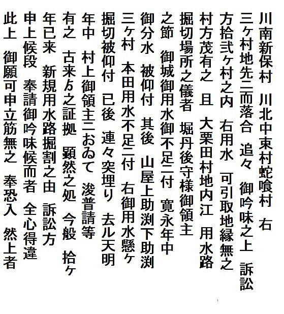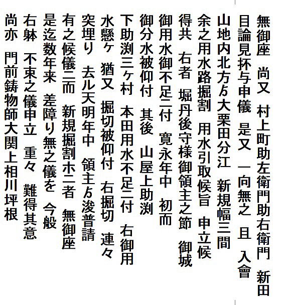 | 《解説》 済口證文は示談成立の証文です。訴訟方(原告)と相手方(被告)で取り交し、評定所(幕府の最高裁判所)へ一通提出します。 内容は大きく二段に分かれています。前段は、双方の言い分の確認。つまり、①これまでの訴状の内容と②それに対する返答書の内容です。両者の言い分を並べた上で、後段に③合意の内容が書かれています。言うまでもなくこれが最重要です。 ~文書の内容~ 長い文書ですが、結論だけ簡潔にまとめれば次のようになります。 ① 原告の訴え 村上町の助左衛門・助右衛門が畑等を新田にするために、藤沢川の上流に新規に幅三間余の用水路を掘り割り、その下流側を堰で締め切って、藤沢川の水を取った。その水を被告の村々へも分けた。これを元の形に戻させてほしい。 ② 被告の反論 ア 原告は、藤沢川の水に関係のない村々で、訴訟は、平太郎ひとりの謀略だ。 イ 藤沢川の上流は中束村の入会山だ。15村の入会用水林だというのは、偽りだ。 ウ 村上町の助左衛門・助右衛門が新田を企てたことは無い。 エ 田麦掘割は堀丹後守が造り、神納3村へも分水。十年前に補修工事をしただけで、新規掘割はしていない。 ③ 合意の内容 ②のアとエの通りなのに、今回、新規掘割ということで裁判を受けるのは、全くの思い違いだった。したがって、この堀切場の用水引取りはこれまで通りということで合意した。 関係ない村が被告にされたことや、証拠の無い言い争いは、扱人が預かることで決着した。 ~説明~ 合意の内容を読んでみて、びっくりです。全く、被告の言い分のまま。腰砕けではありませんか。思わず、「平太郎、どうした?がんばれ?」と言ってしまいたくなる内容です。 これは一体どうしたことか。こんなことがあるはずがない。もし、②の言い分が事実であるなら、そもそも、こんな大訴訟まで持っていけるはずがないのです。 ①の訴えが事実だからこそ、幕府も訴状を受理したのでしょう。では、なぜ、こんな合意内容になるのか。これはおかしい。裏に何かあるに違いない。 これが、「田麦掘割訴訟事件」の調査研究の動機でした。 歴史館保管の文書6通のほかに、「村上市史」「神林村誌」にたくさんの史料が掲載されていました。にもかかわらず、「関川村史」を含めた3市村史誌とも、真相の解明には至っていません。 今回の調査研究によって、ようやく真相が解明できました。 それで、まず、WEB上に調査研究の結果を公開しました。 次に、村教育委員会主催の講演会で概要を発表しました。 そして、関川村広報誌に、令和4年9月1日号から令和5年2月1日号まで、6回にわたって歴史館保管の文書を1通ずつ紹介しながら、事件の全容を説明してきました。 それらについては、下記のWEBページでご覧いただけます。 調査研究の結果は、⇒こちらから それを簡潔にした講演会用プレゼン(PDF)は、⇒こちらから 村広報誌連載記事と解説は、⇒こちらから |