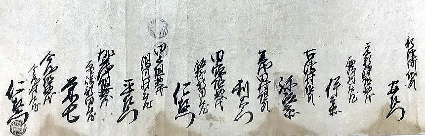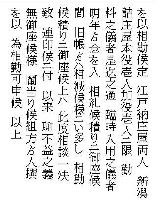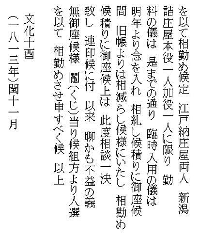 | 各村々からの年貢米を海老江湊の御蔵に納めた後も大変な作業が待っています。それで、岩船郡と蒲原郡の幕府領村々は、各組惣代庄屋による納税のための組合を作り、相談し合って、共同でその作業に当たっていました。 日本海を廻航する千石船に積み込んだ米が無事江戸の御蔵に届くまで管理監督するのも惣代庄屋たちの責務です。この文書はそのための経費がかさむので、少しでも減額しようとして取り決めたことが書いてあります。 江戸まで出張して御蔵納を管理監督する庄屋が二名。新潟湊へ出張する庄屋も二名。外に上乗り役、つまり船に乗り込んで管理監督する当番もいたようです。 船の運賃は幕府側が負担していましたが、担当庄屋の出張滞在費用はすべて納税側の負担です。 この文書に押印してあるのは、二十一人中、小見村庄屋平太郎と金屋村庄屋仁左衛門の二名だけなので、回覧押印途中の控なのかもしれません。 「関川村史」には、文政五(一八二二)年の赤谷村庄屋三助の江戸出張滞在記録(四月十日出立~十二月四日帰村)が載っています(五三七頁)。 それを読むと、納税側の取り分の米も船に積み込んでいて、それを換金して納税業務管理監督用の出張経費に当てていたようです。仕組みはなかなか複雑です。それからすると、文書にある、十五両+十五両は必要経費の内のほんの一部の様です なお、三助の滞在記録は、「近世関川郷史料五」に全文掲載されていて、江戸滞在中の出来事が様々記録されています。なかなか興味深い内容です。 意外なことに、この文書には、出張する庄屋はクジ引きで決めると書いてあります。なにしろ江戸滞在は長期になります。中世以来、クジ引きは神の意志とされていますから、文句の出ないようにクジで決めていたのでしょうか。 実は、どうもそうでもないような感じのする文書も別に出てきています。江戸廻米については仕組みが複雑で、まだ何通かの文書があるので、今後追々解読して、解明していきたいと思っています。 |