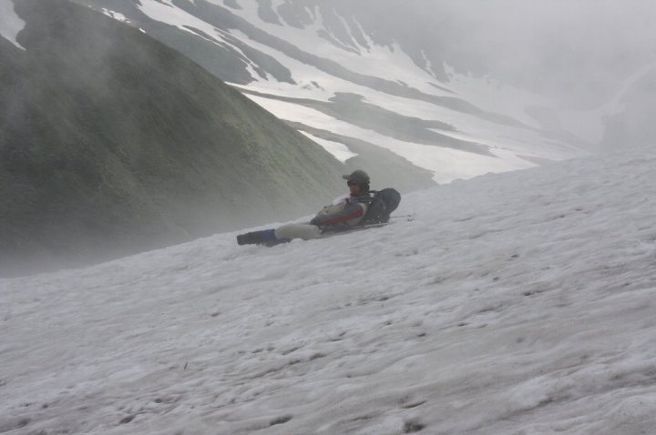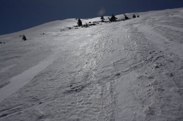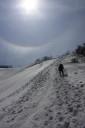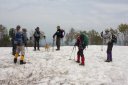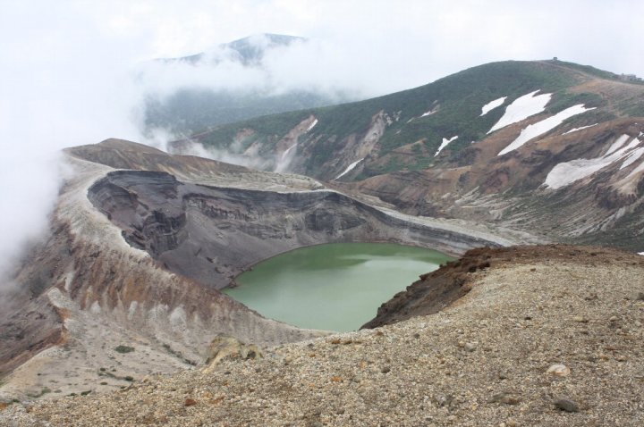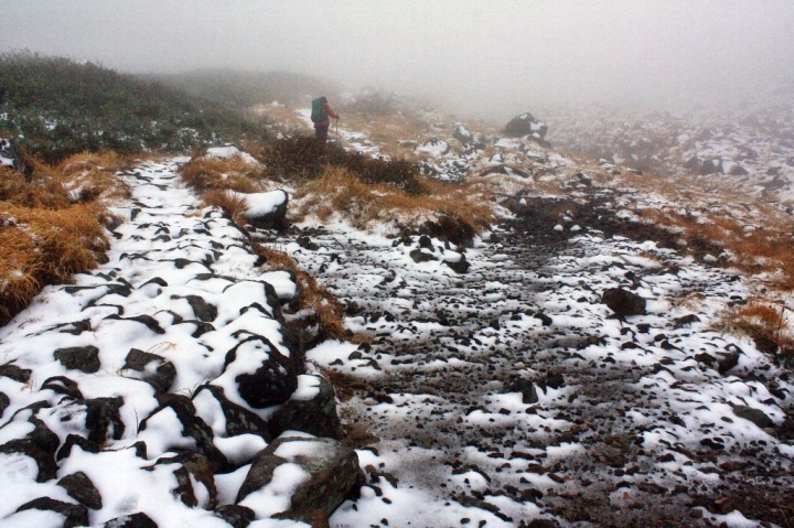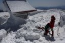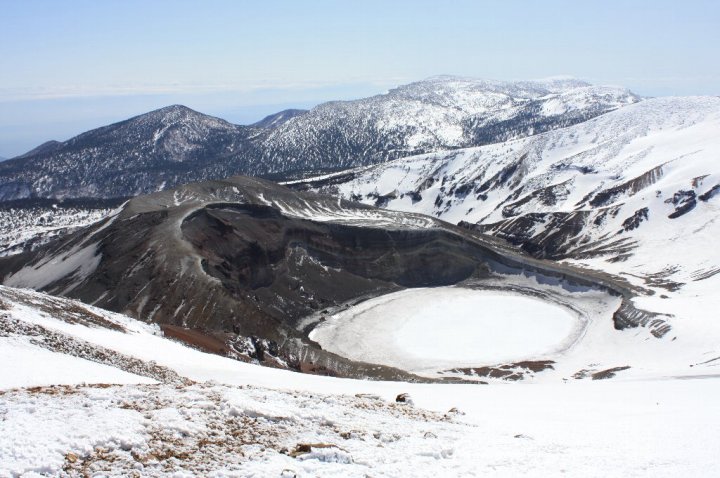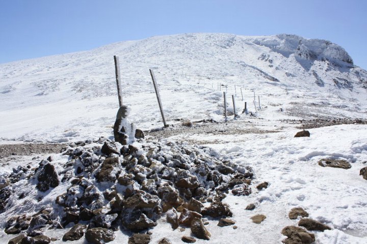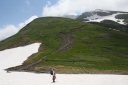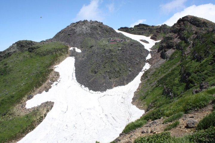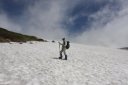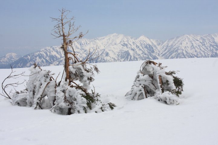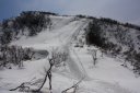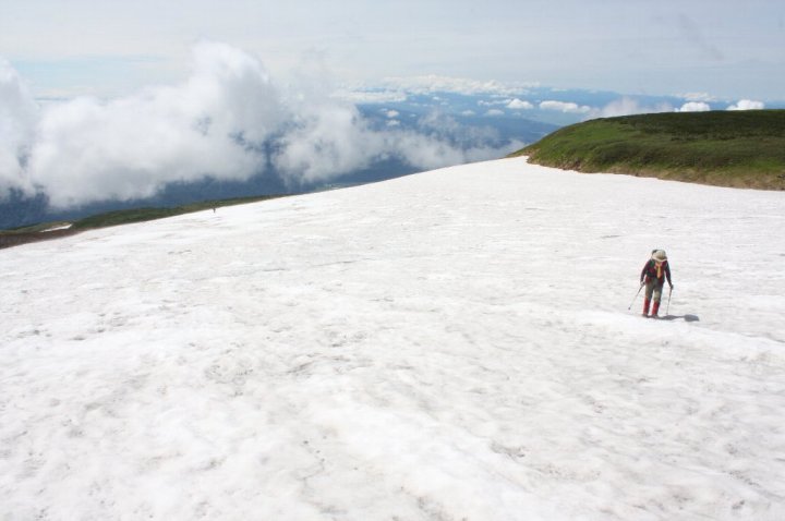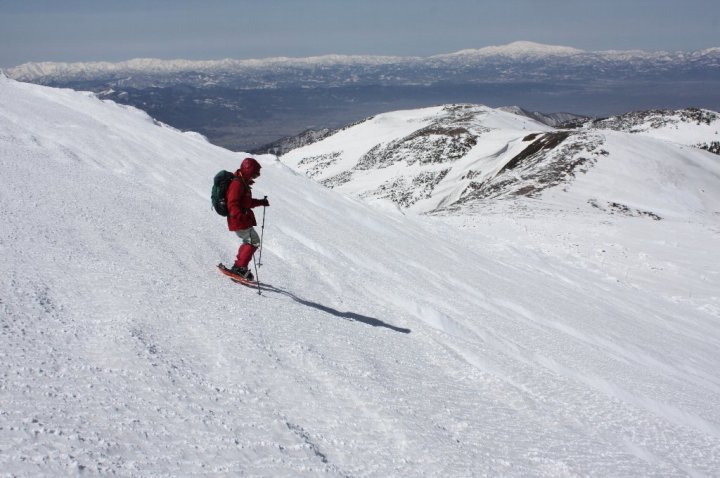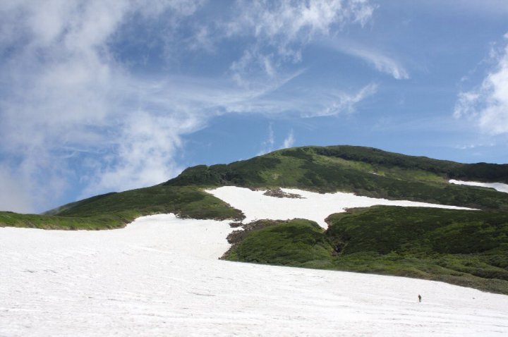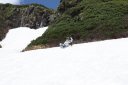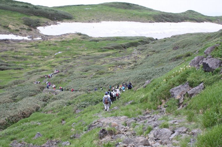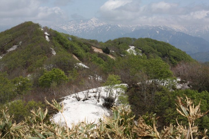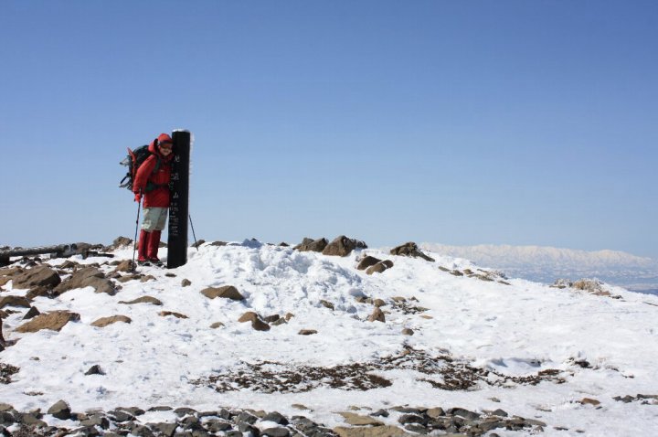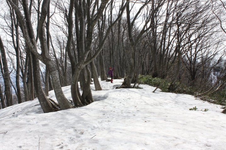4月29日 二王子岳 前夜からの山泊らしき車もあってビックリするほどの混雑状態 神子石の下からは雪上の歩き